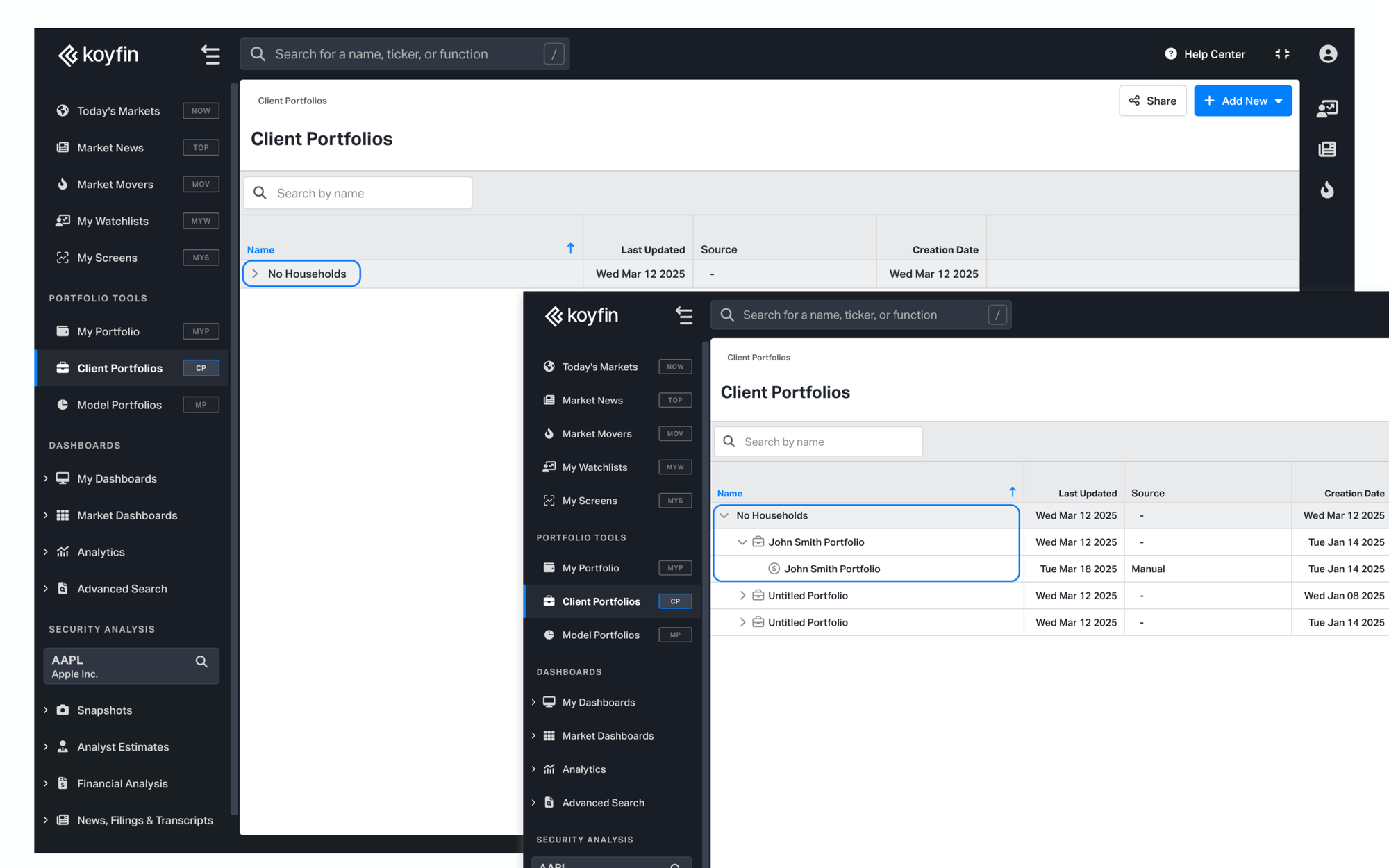 We’re excited to announce some big upgrades to Client Portfolios. We’ve introduced a three-tiered structure that allows you to represent the Households, Portfolios, and Accounts of your client’s investments.