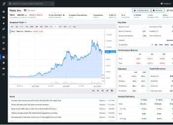 Real-time price data, business summary, key analytics metrics, price performance charts, recent news, and earnings estimates.