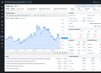 Real-time price data, business summary, key analytics metrics, price performance charts, recent news, and earnings estimates.