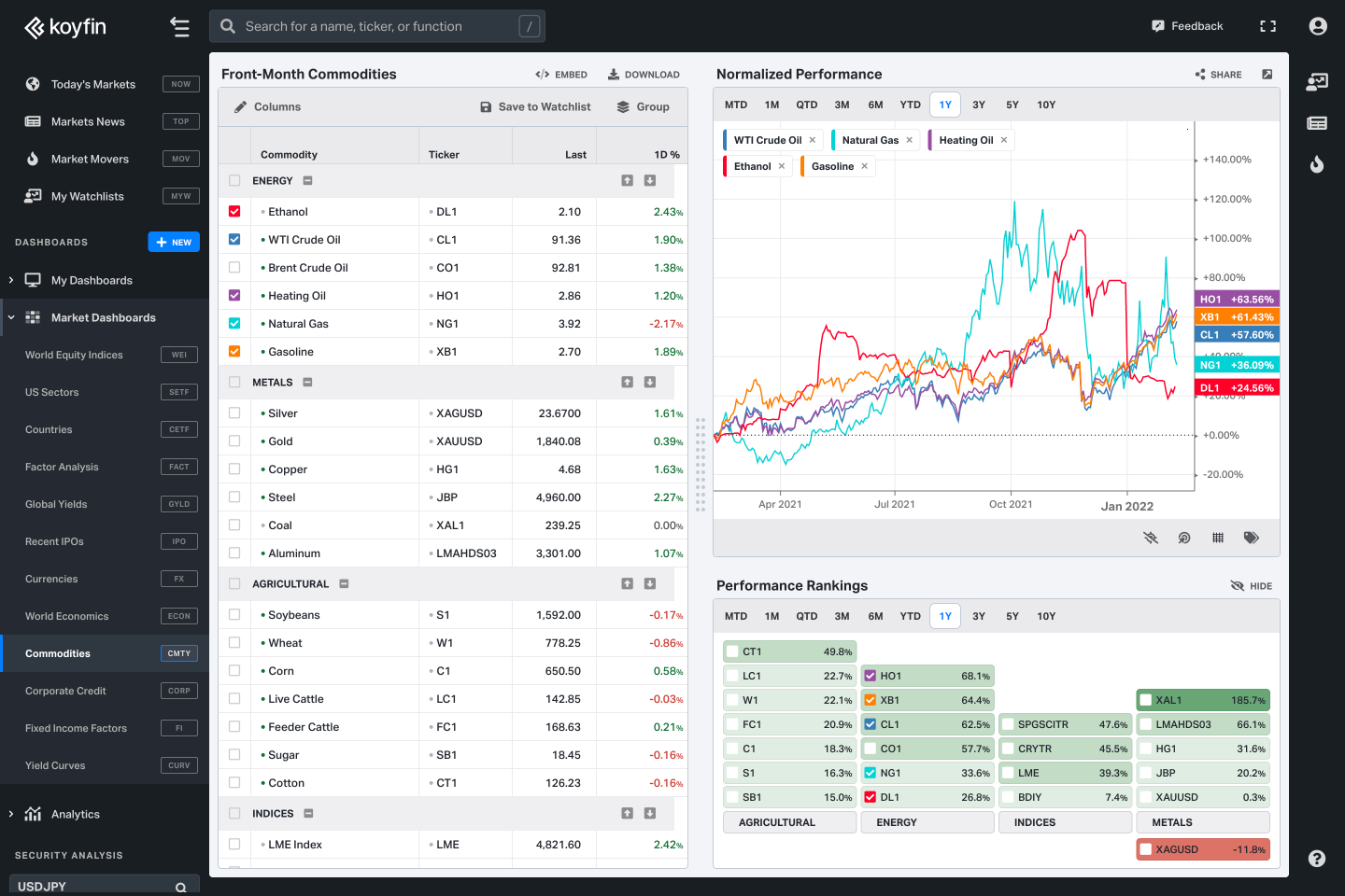 Take any intriguing scenario with commodities futures and add it to My Dashboards for instant recall and further use. Pick our brain with the commodities page in Market Dashboards for the best pre-bundled ideas.