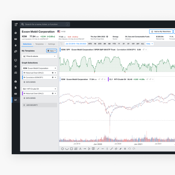 Understand how commodity prices can affect the markets. Analyze stocks, ETFs, bond yields or economic data to analyze price, correlation, beta, or any technical indicator — all in one place.