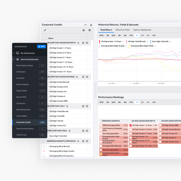 Vivid graphs highlight corporate credit. We feature historical returns, yields, and spreads. Linked tabular data show performance by category and time.