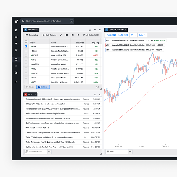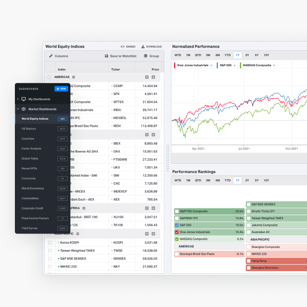 Deploy My Dashboards to create custom watchlists tethered to indices. Tailor them using data points that fit your unique investment style and preferences from hundreds of sortable criteria.