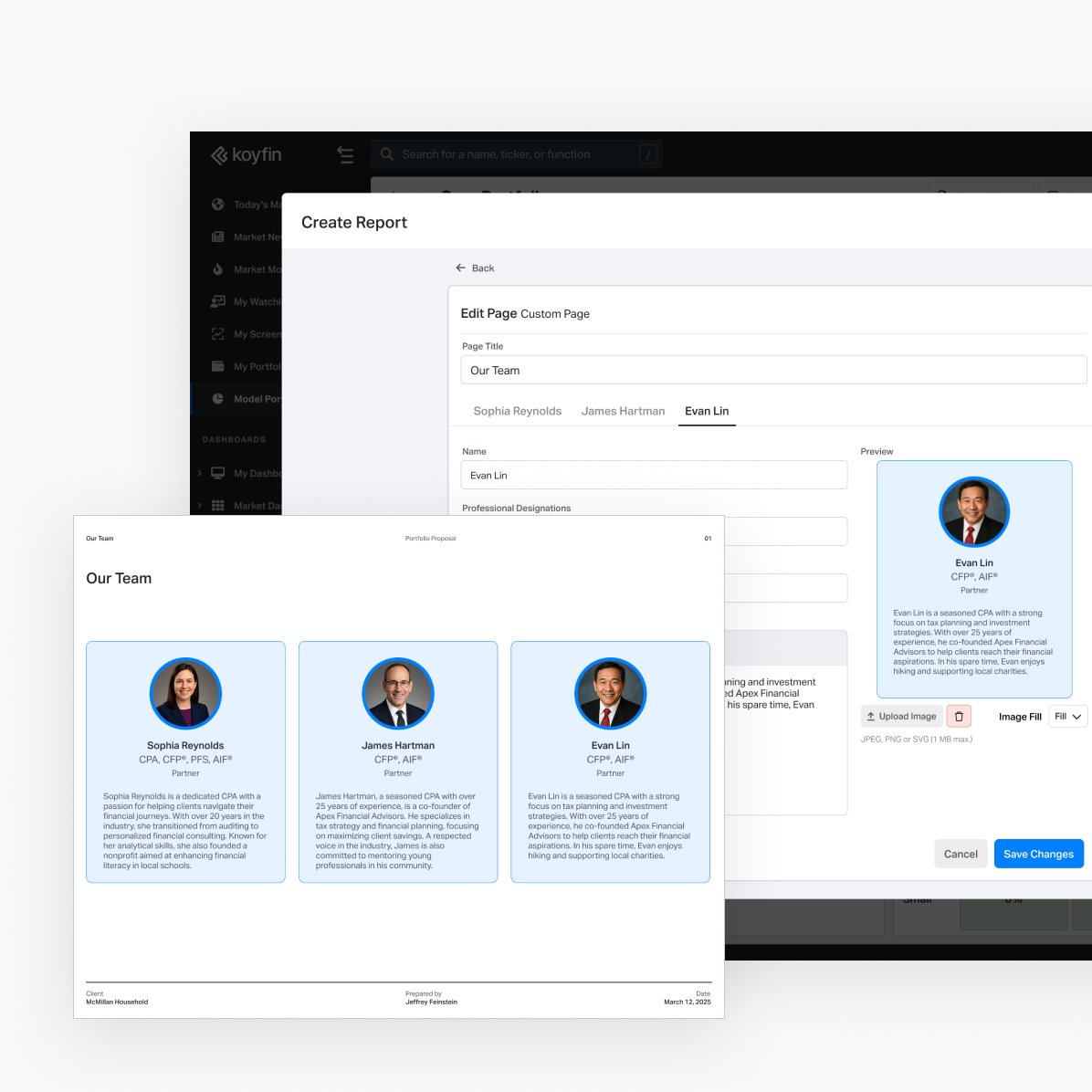 Download or share reports with clients and colleagues directly from Koyfin, fostering transparency and collaboration.