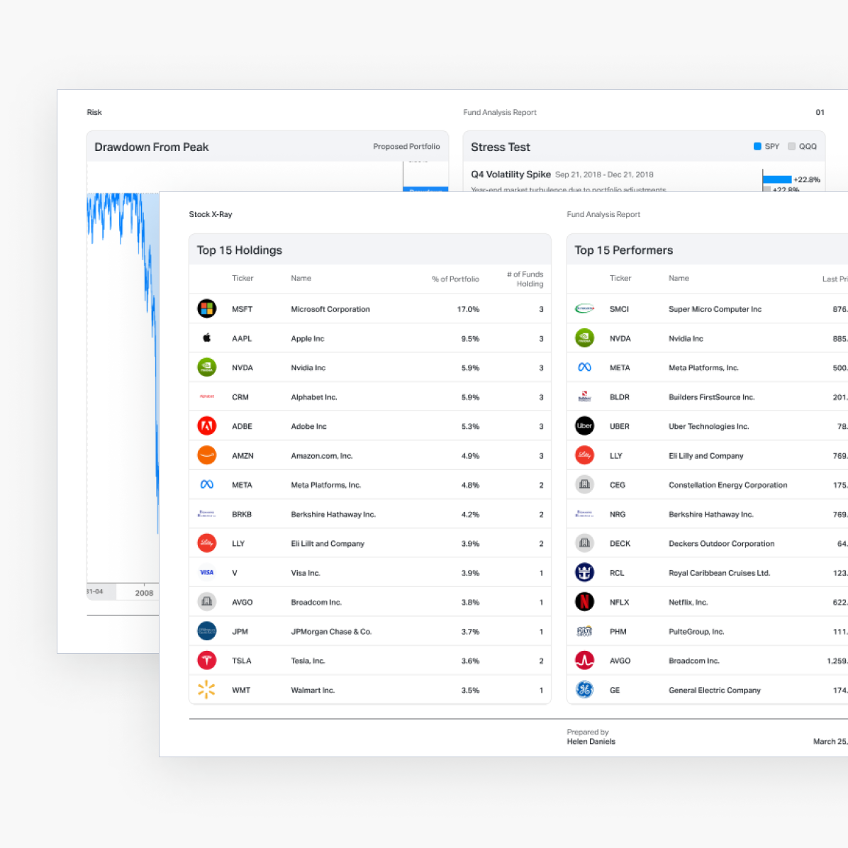 Easily generate and customize reports for portfolios and funds. Compare performance, analyze risk, and track progress – all with a professional touch.