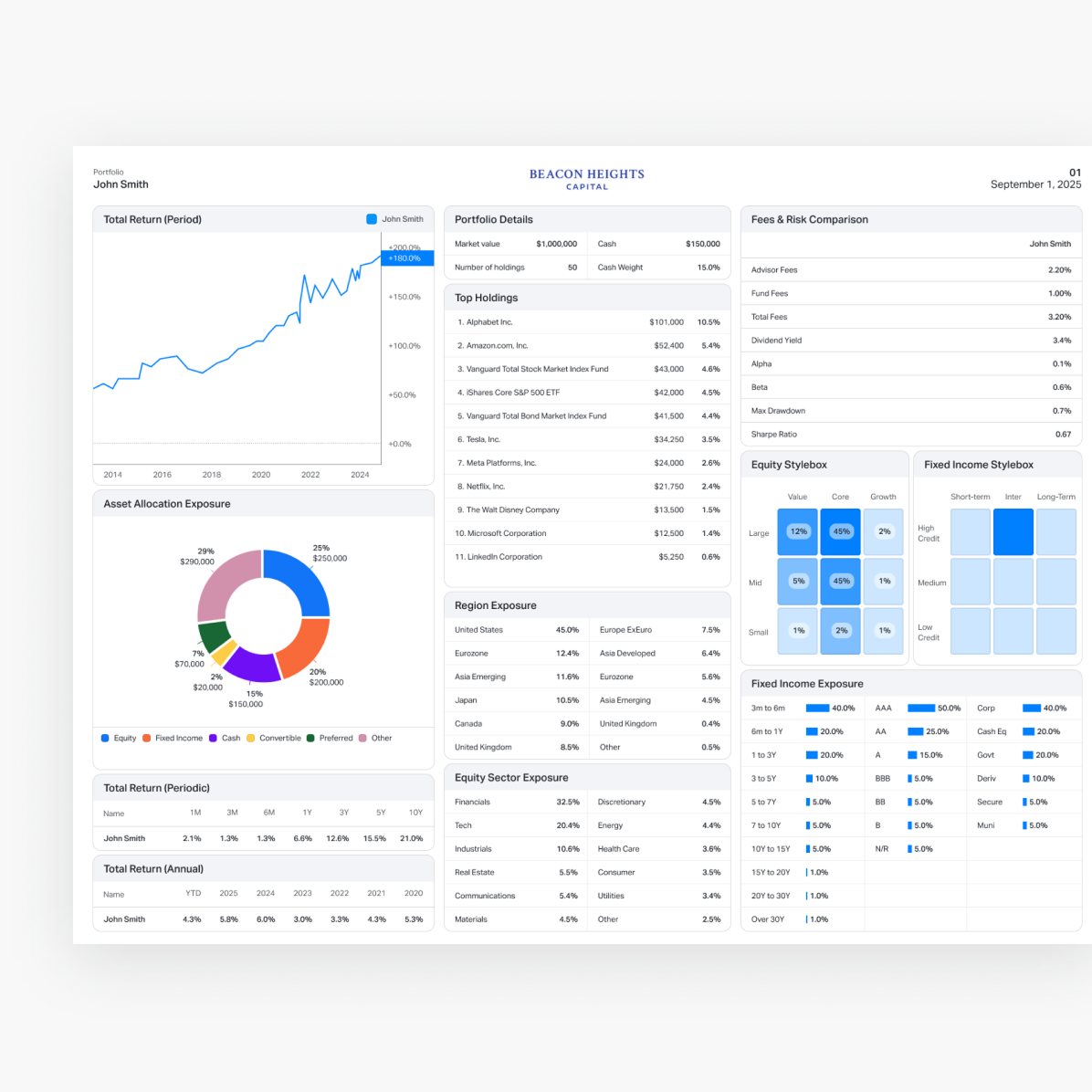 Gain a holistic view of model portfolio performance, risk, exposures, and holdings. Compare against benchmarks and communicate insights with professional, client-ready reports.
