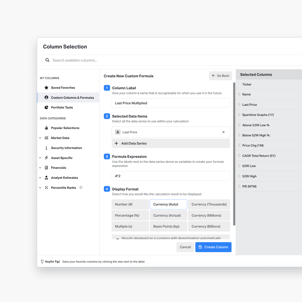 This feature allows you to manipulate data with some simple math operations, saving you time and unnecessary effort. You can define custom formula calculations and add them as columns to your watchlists.