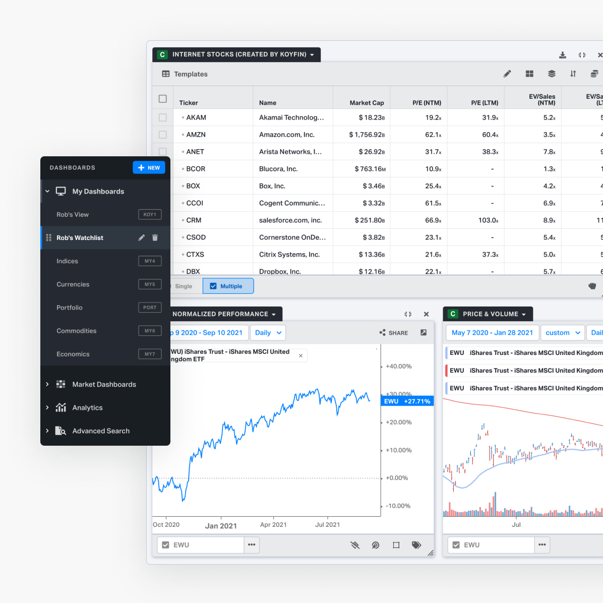 Create a watchlist of your Portfolio to easily keep track of your investments. Add your watchlist to a custom dashboard and you’re starting to unlock the true power of Koyfin.