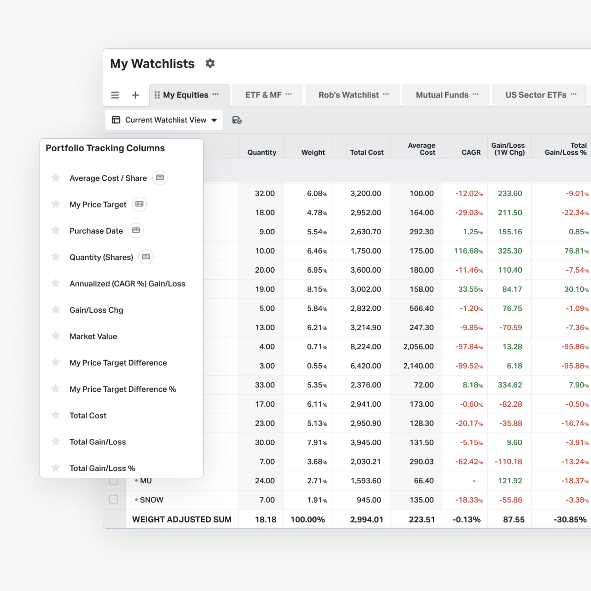 Create a configuration of columns and table settings which you can save and reuse with other watchlists.