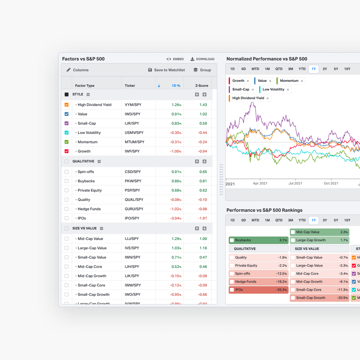 Get a more complete view of the markets with our ready-made market dashboards. Covering macro themes like sectors, factors, govt yields and economic data.