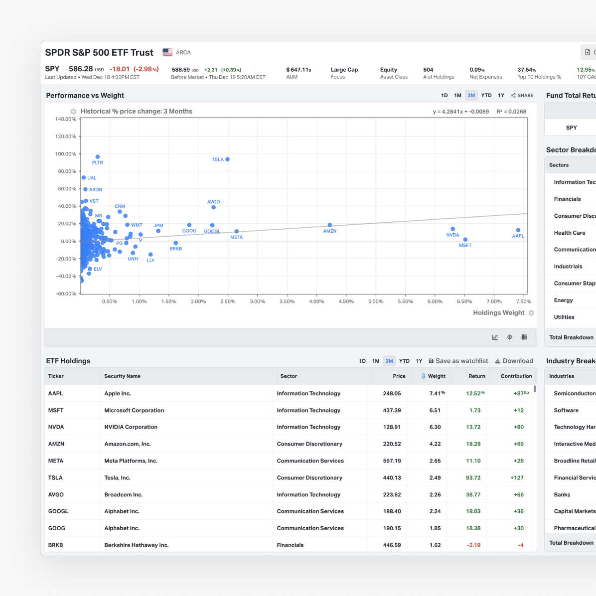 Get a detailed breakdown of ETF and mutual fund holdings, including performance vs. weight, total returns, and sector or industry allocation. See exactly what you're invested in to better assess diversification and risks.