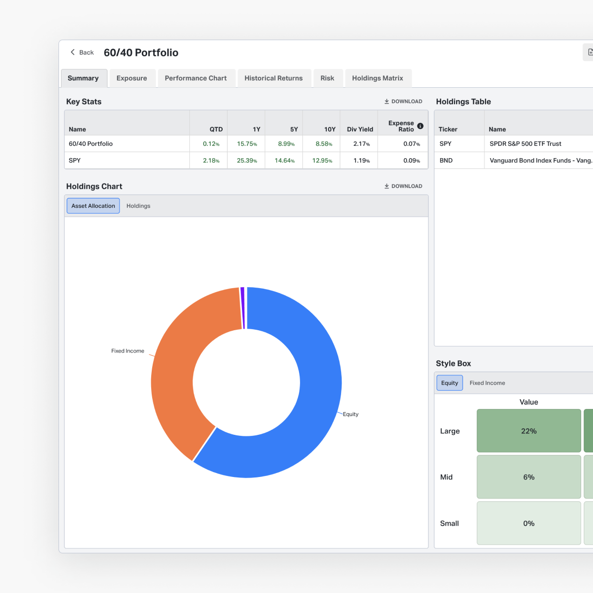 Construct model portfolios with short & leveraged positions, adjust allocations dynamically over time, compare portfolios to benchmarks, track exposures by asset class, and view underlying holdings.