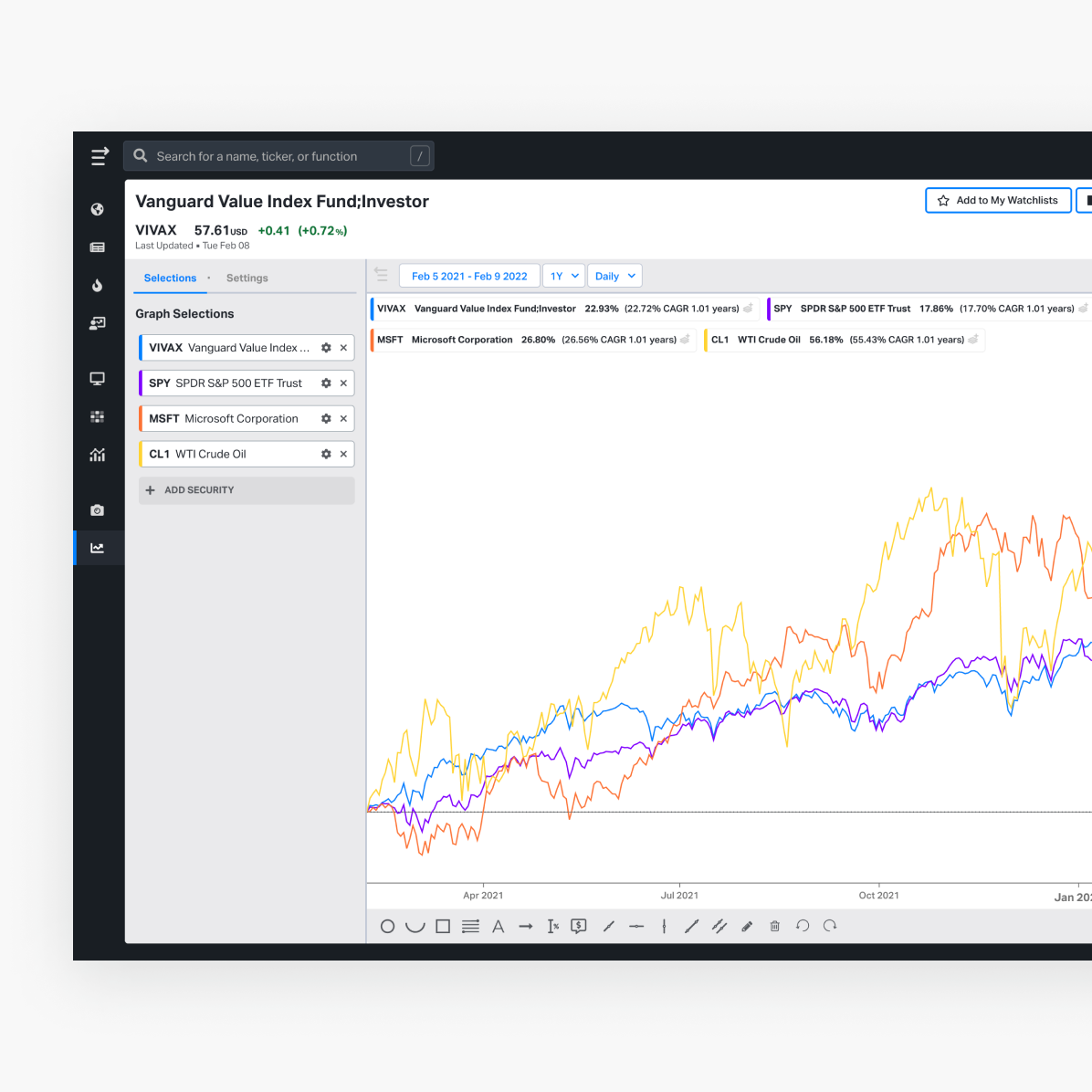 Easily track performance vs. any security such as stocks, ETFs and other mutual funds.