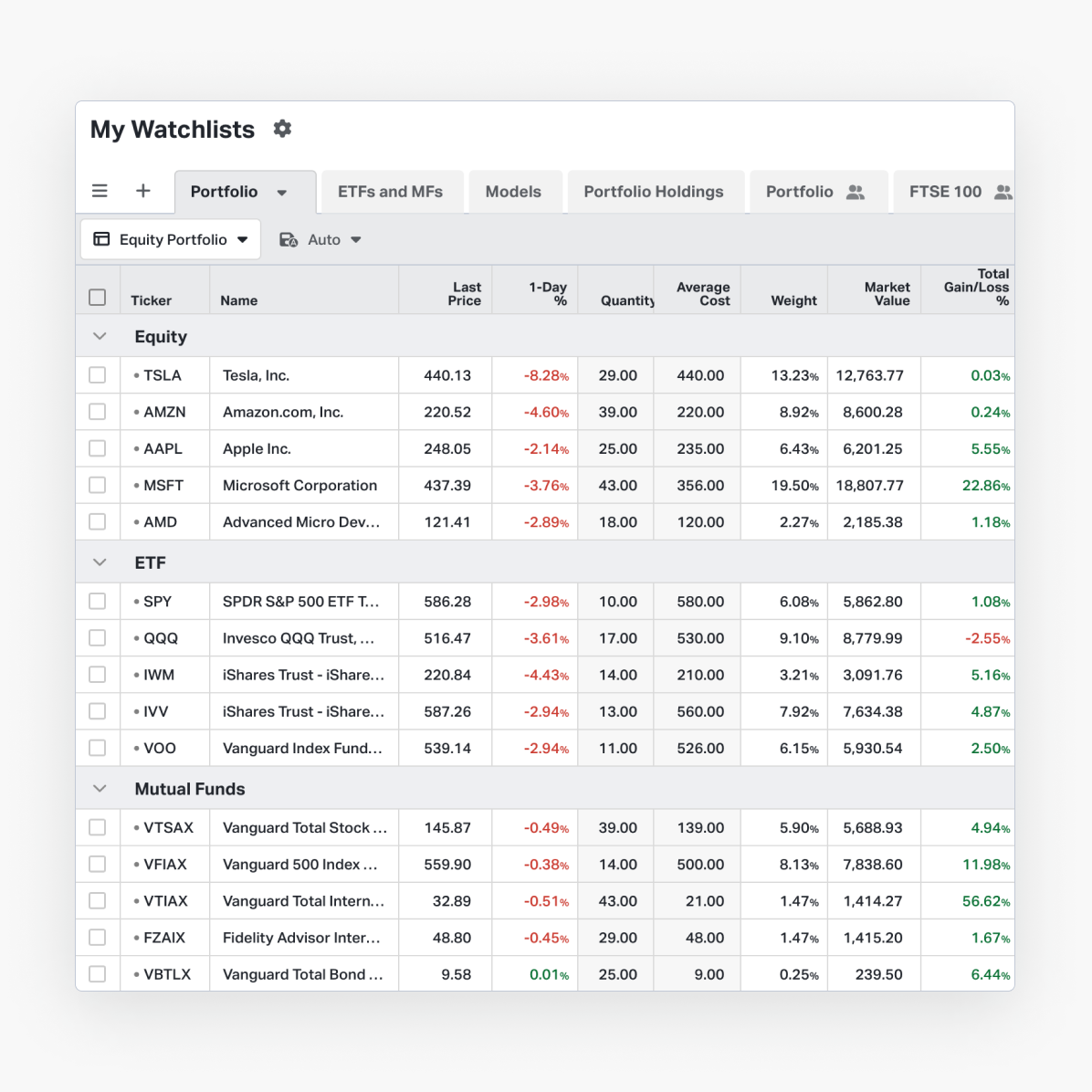 Track watchlists of stocks, ETFs, and mutual funds in one place. Customize for specific strategies, get real-time updates, and compare metrics to keep your research focused and effective.