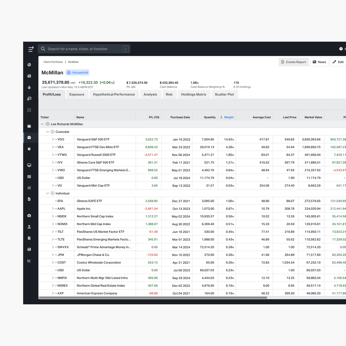 Manage client accounts with a household → portfolio → account structure. Track consolidated holdings, performance, and allocations.