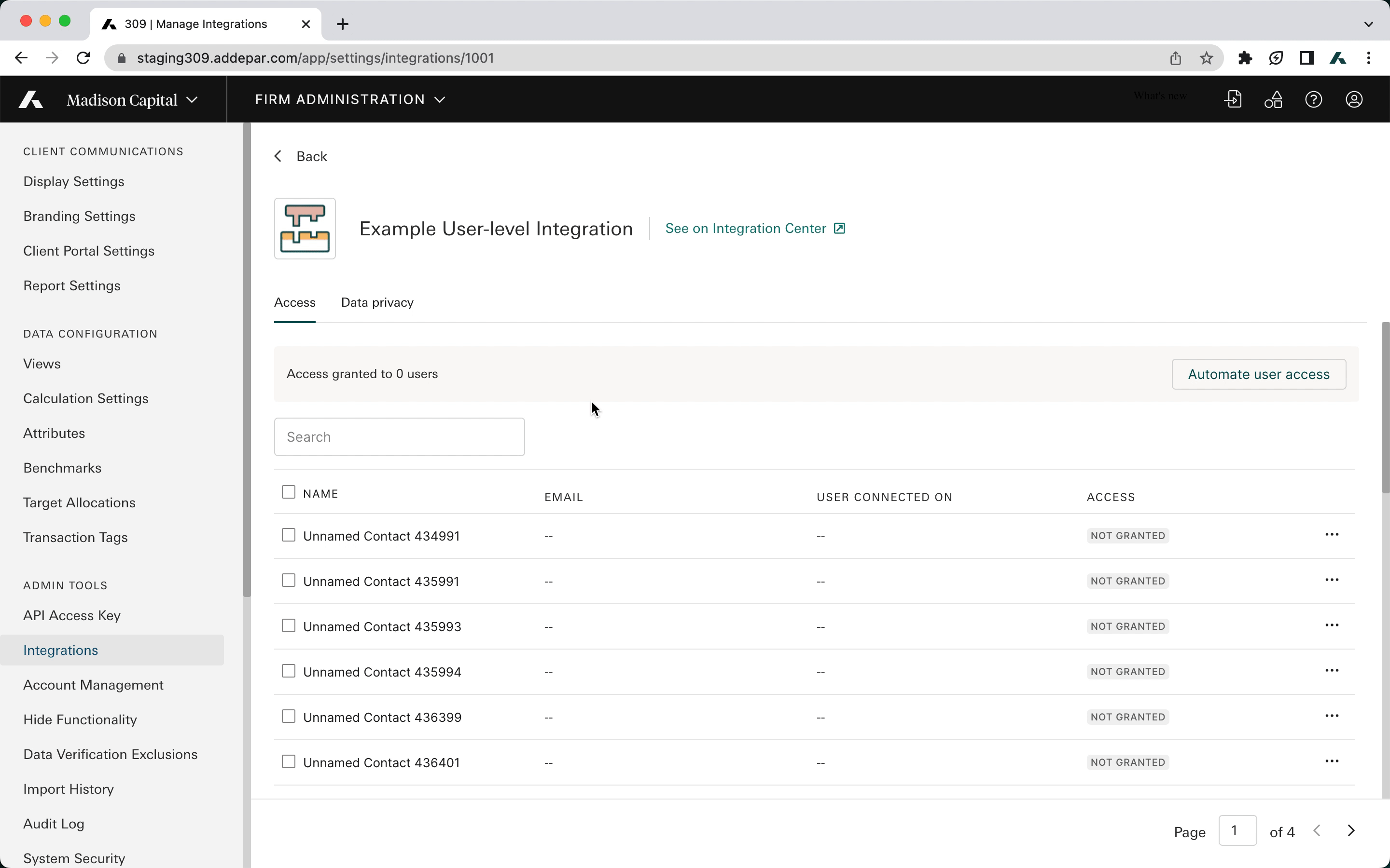 Who can grant access: The person granting access must have the Integration user access permission enabled under Firm Administration. This is typically a Firm Admin.