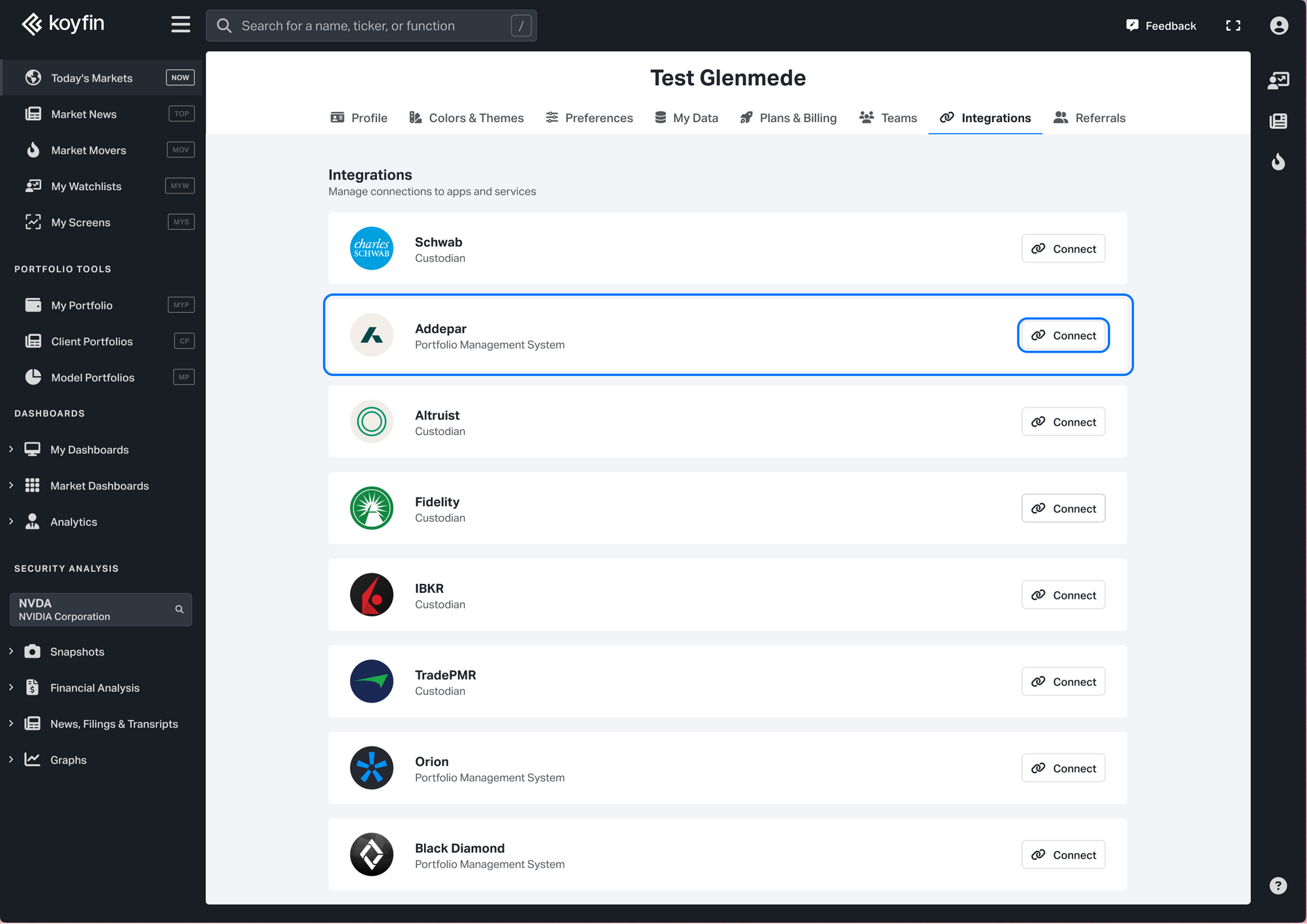 2. In the Addepar section, click Connect. You’ll be redirected to the Addepar login page. After logging in, your account will be connected to Koyfin.