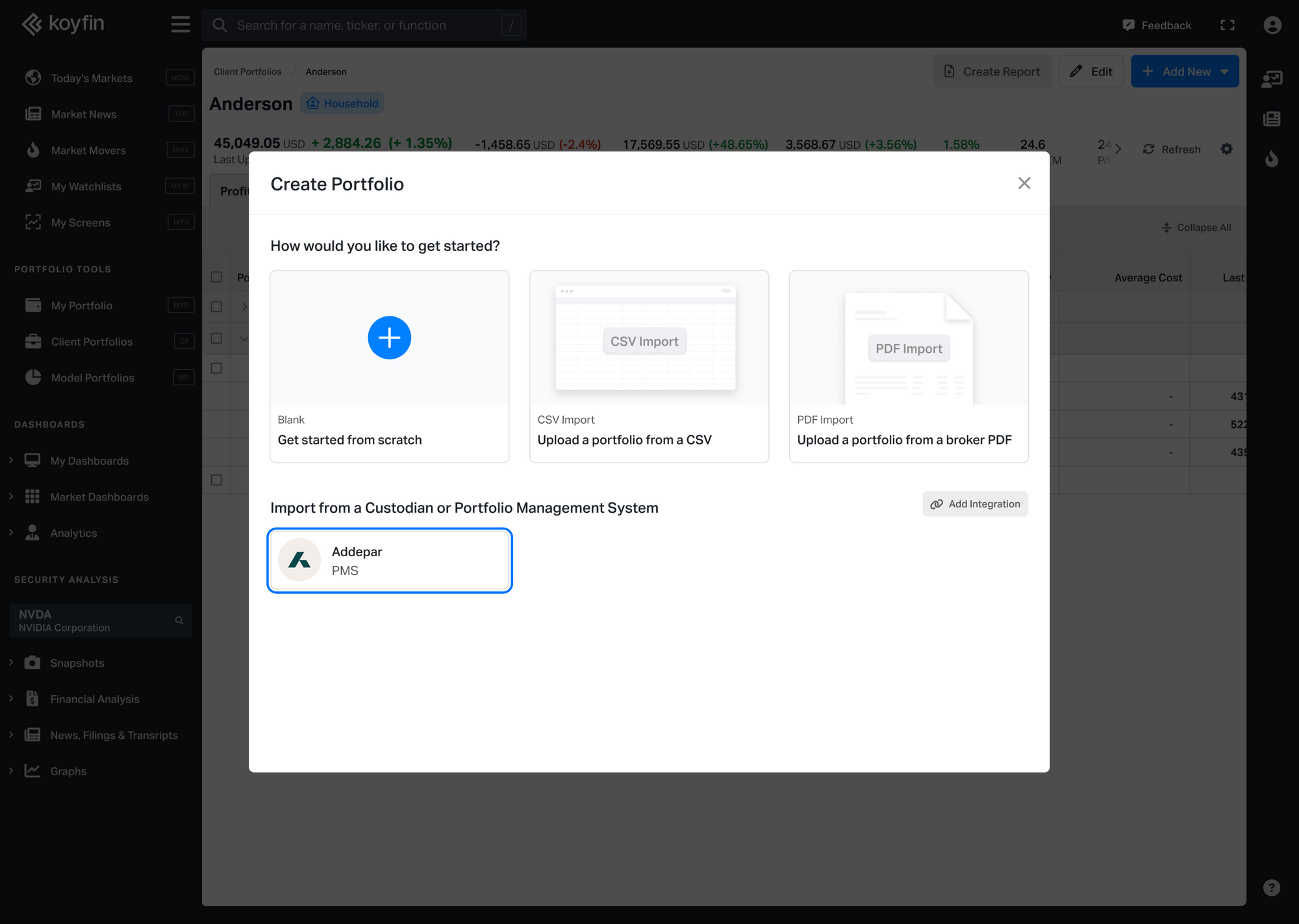 Koyfin supports direct integration with Addepar. This guide outlines how to connect your Addepar account and import client data into the Client Portfolios.