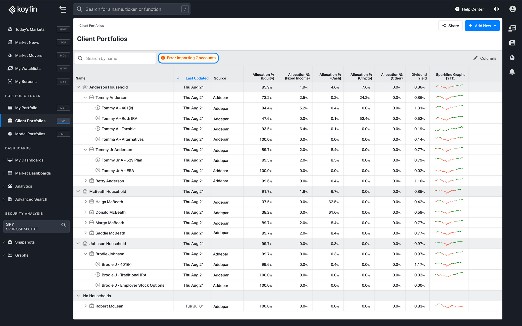 If some accounts fail to sync, a notification appears at the top of the Client Portfolios homepage, next to the search bar, showing how many accounts had errors.