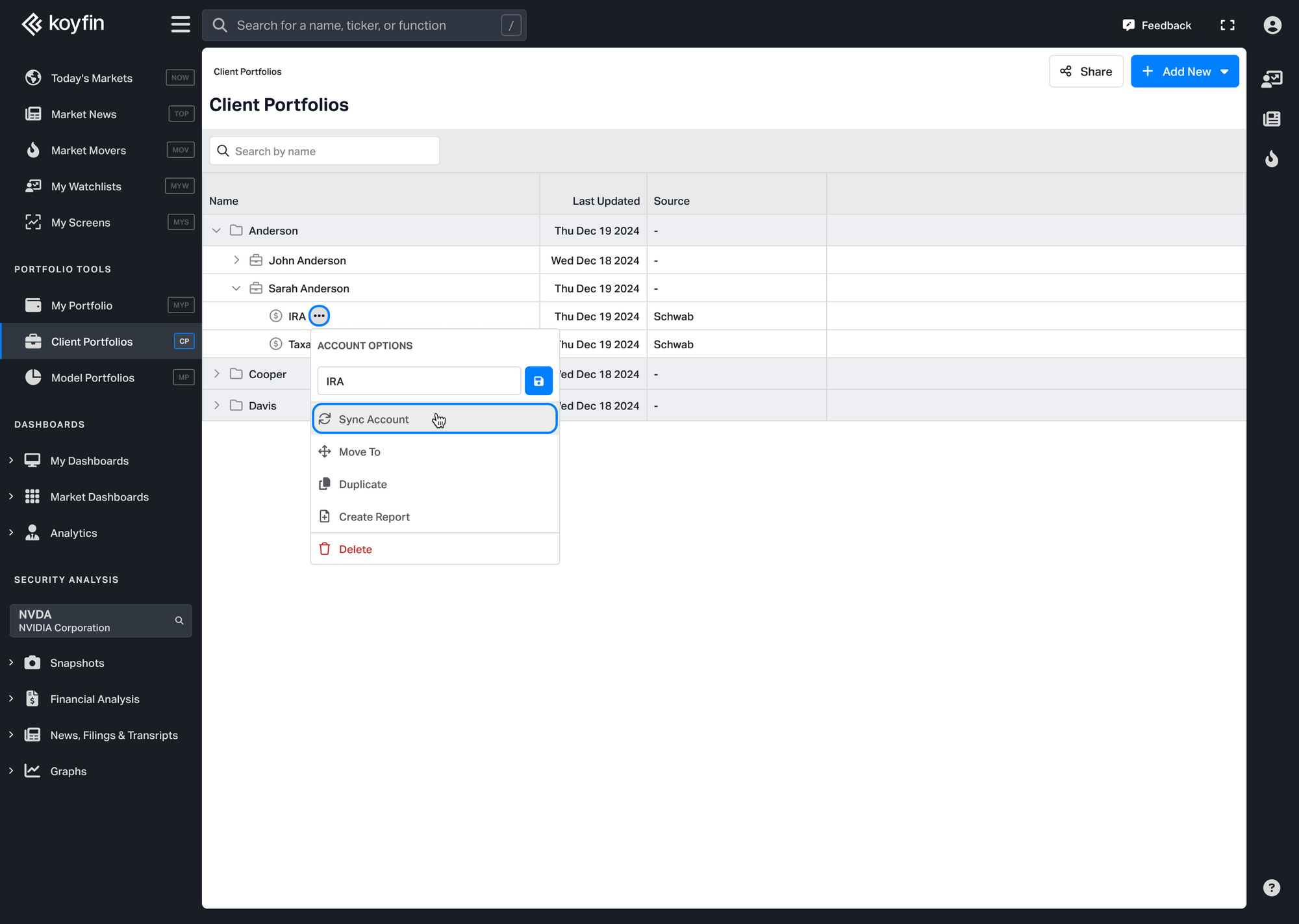 - From the Client Portfolios homepage, hover over the account, click the three-dot menu ⋯ and select Sync Account.