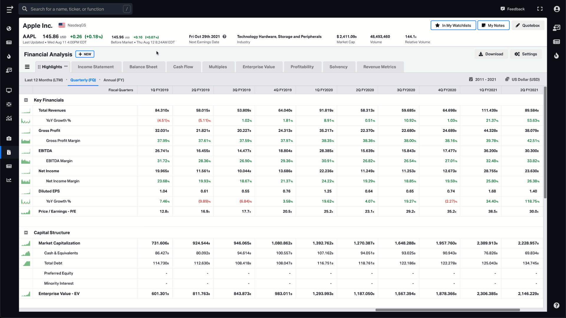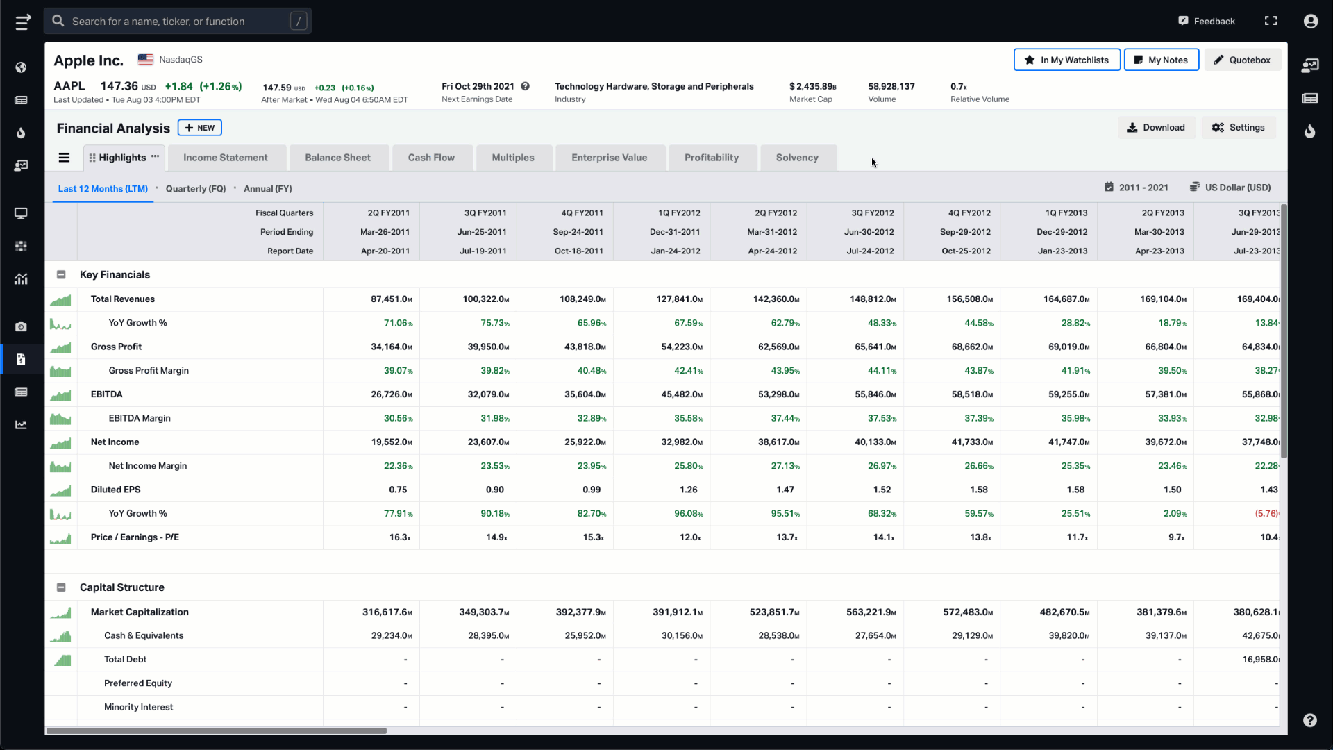 Financial Analysis (FA) on Koyfin encompasses traditional financial statement views such as income statement, balance sheet, cash flow, profitability etc. They provide you with the company’s standard financial results to monitor its performance, understand underlying drivers and extrapolate trends.