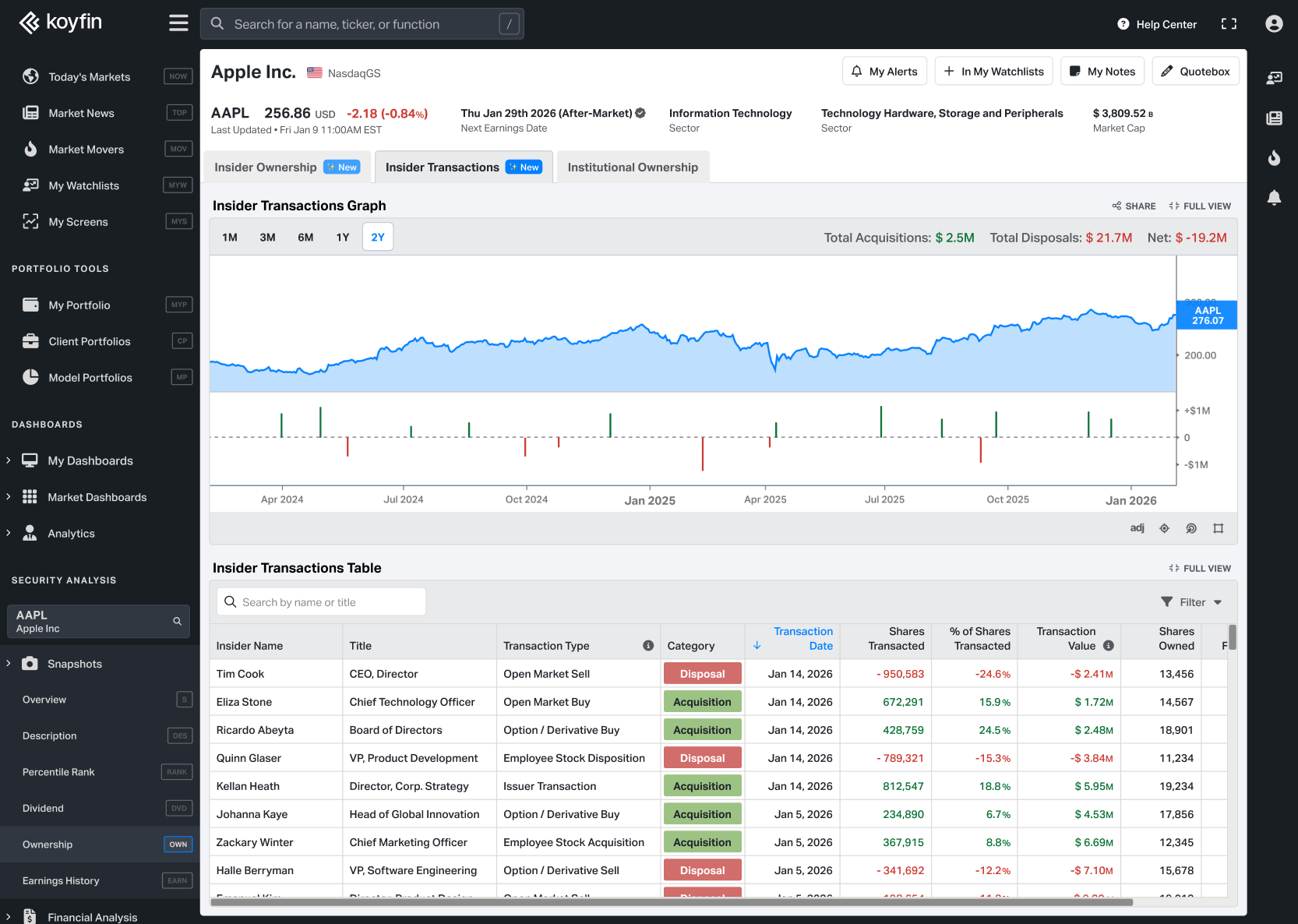 Data for insider transactions comes from Capital IQ by Standard and Poor's and is global in coverage. The transactions table is limited to up to 2 years of history.