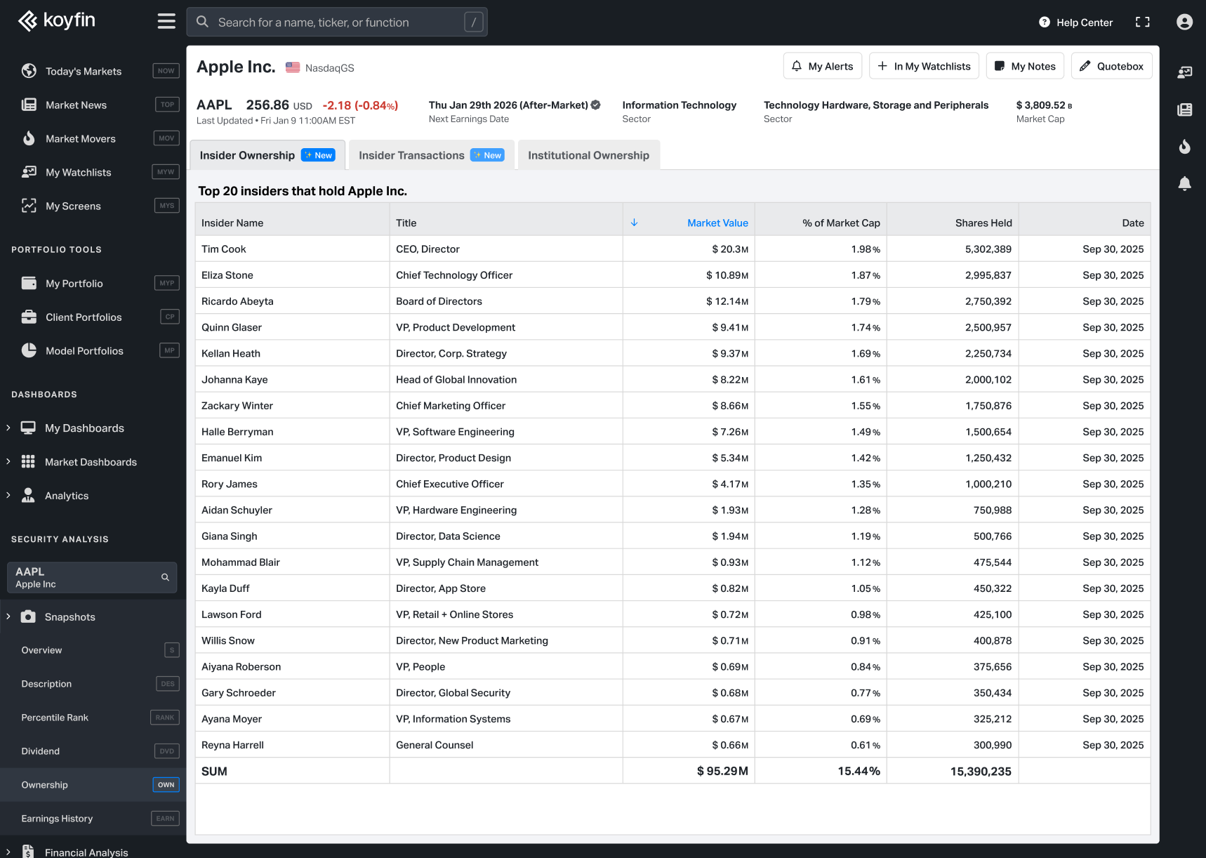 The Insider Ownership snapshot highlights up to the top 20 largest insider owners of a public company. The table displays the name and title of the insider, ordered by largest ownership.