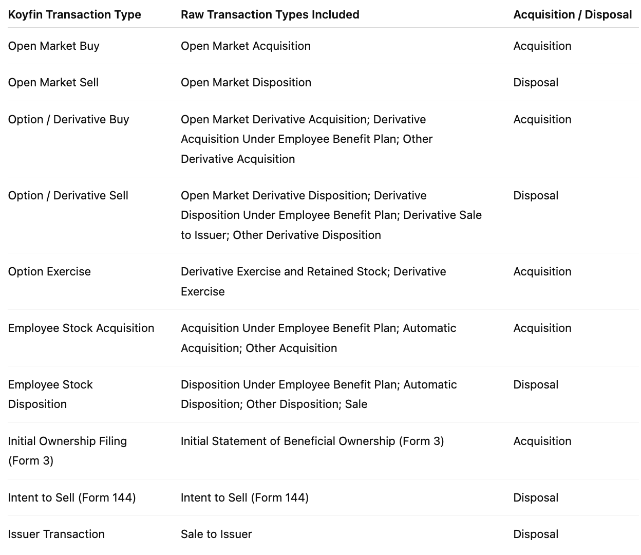 - Transaction Type: Highlights the nature of the transaction. For example, an Open Market Purchase vs. an Employee Stock Option Acquisition. In all there are 24 transaction types, and Koyfin maps these 24 types into 10 buckets, as per below.