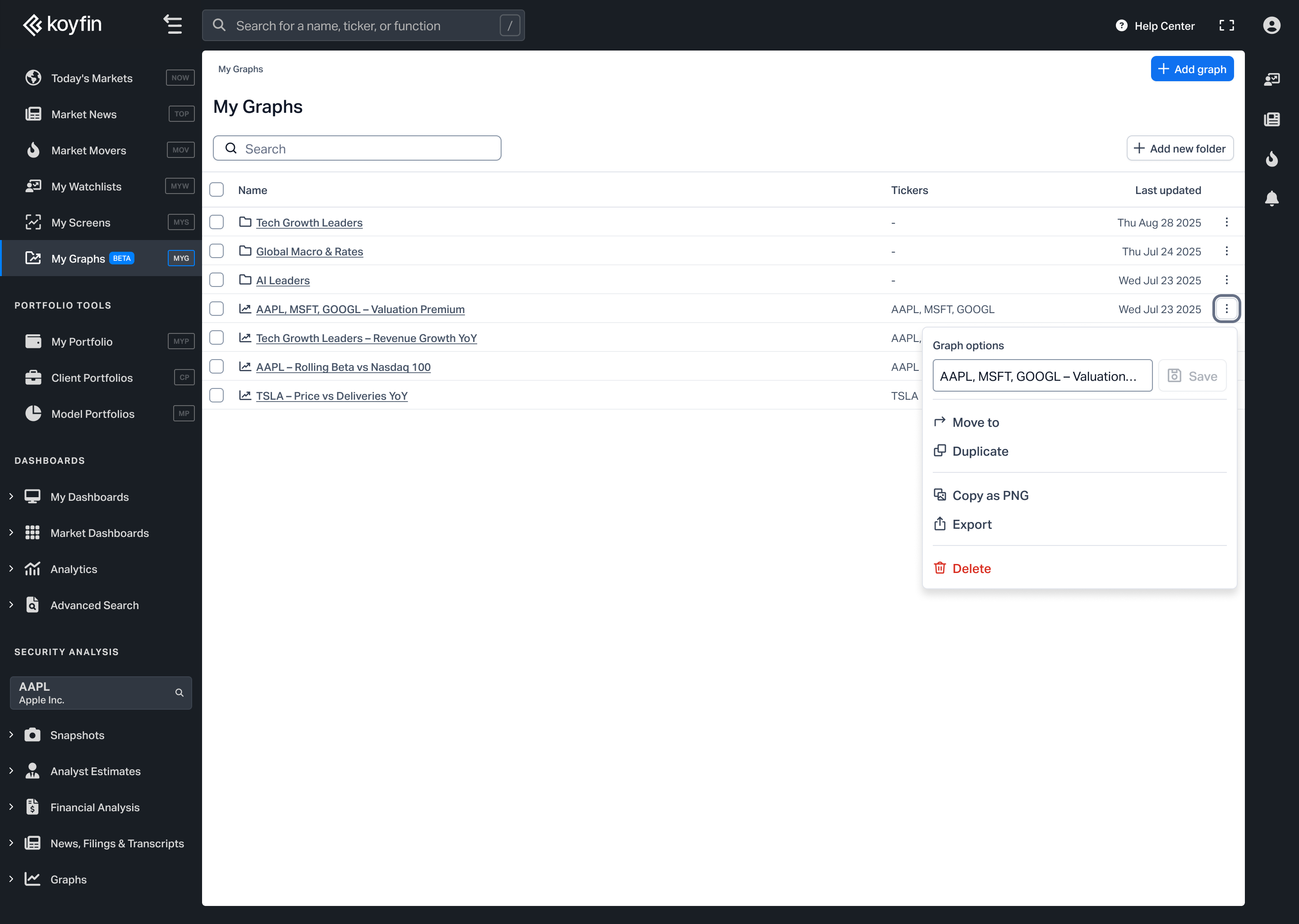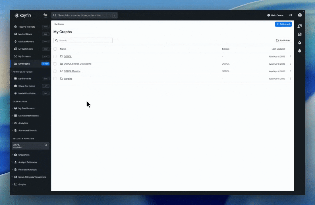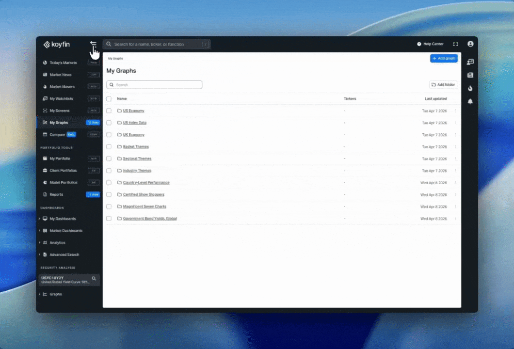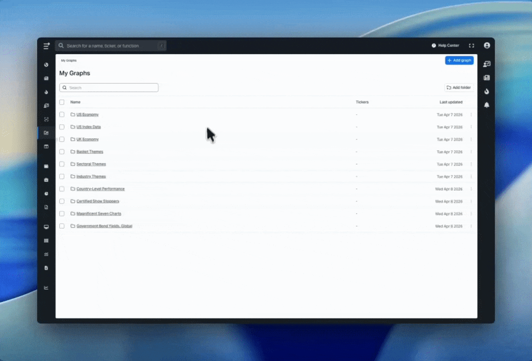 My Graphs is a new section where you can save, organize, and revisit your charts. Each saved chart retains its full configuration, including tickers, data series, time ranges, and settings, and updates automatically with the latest data.