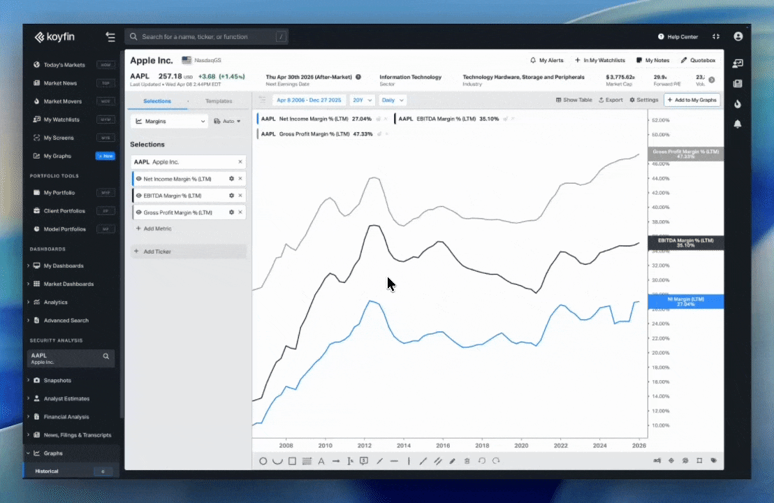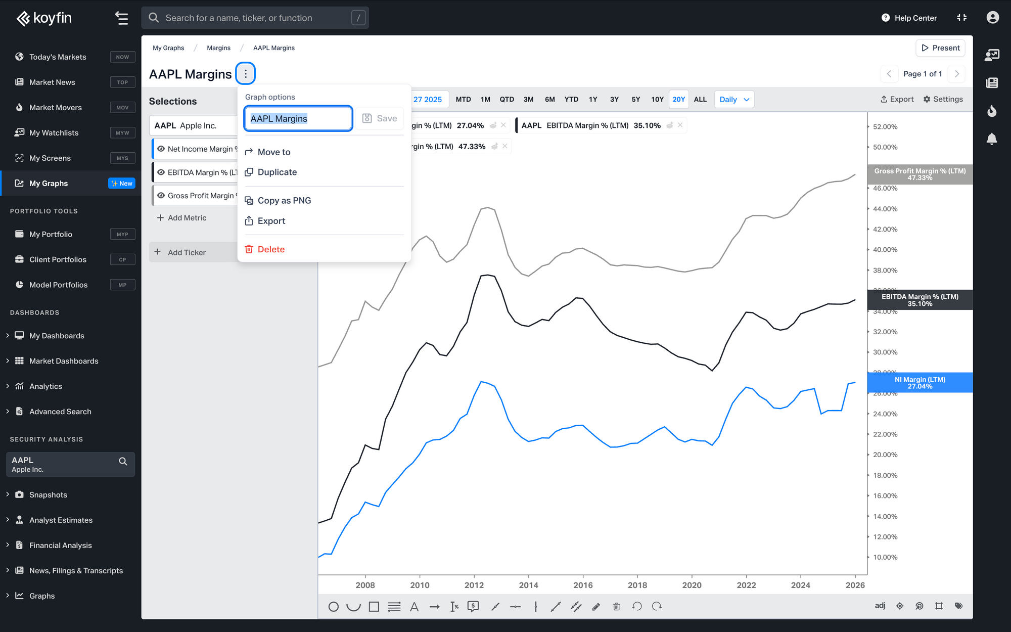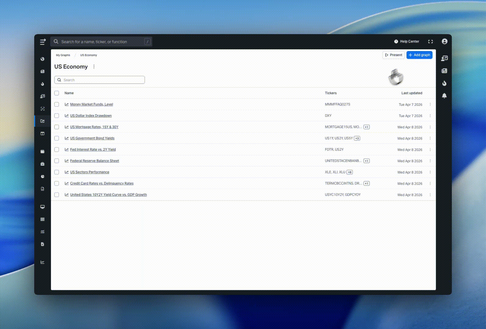 My Graphs is a new section where you can save, organize, and revisit your charts. Each saved chart retains its full configuration, including tickers, data series, time ranges, and settings, and updates automatically with the latest data.