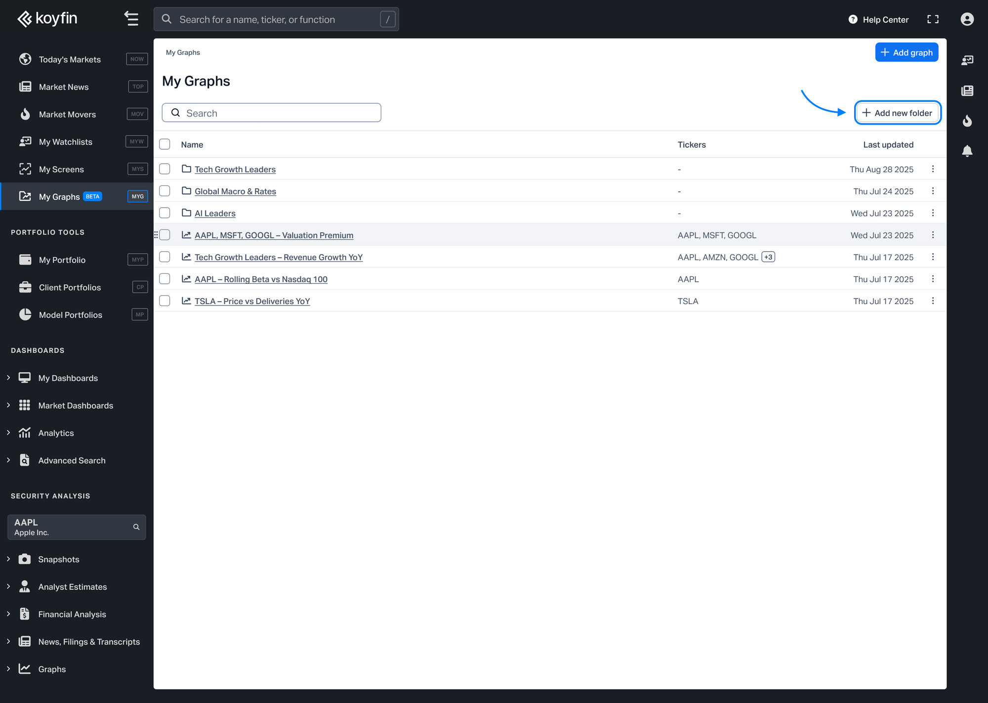 The My Graphs homepage shows all your saved graphs and folders in a table view. To create a folder, click + Add folder in the top right corner of the table.