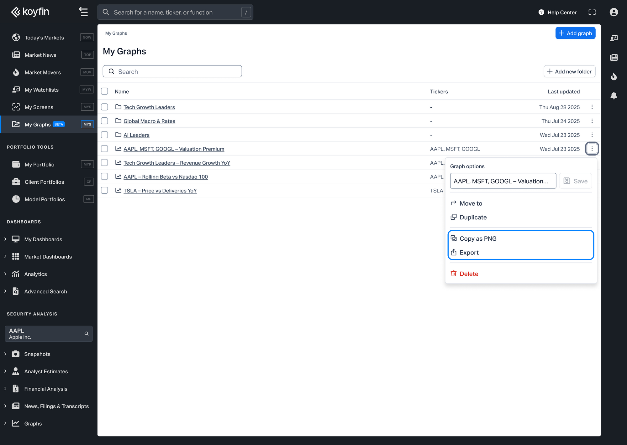 You can copy any saved graph as a PNG or export it using the three-dot menu next to the graph name.