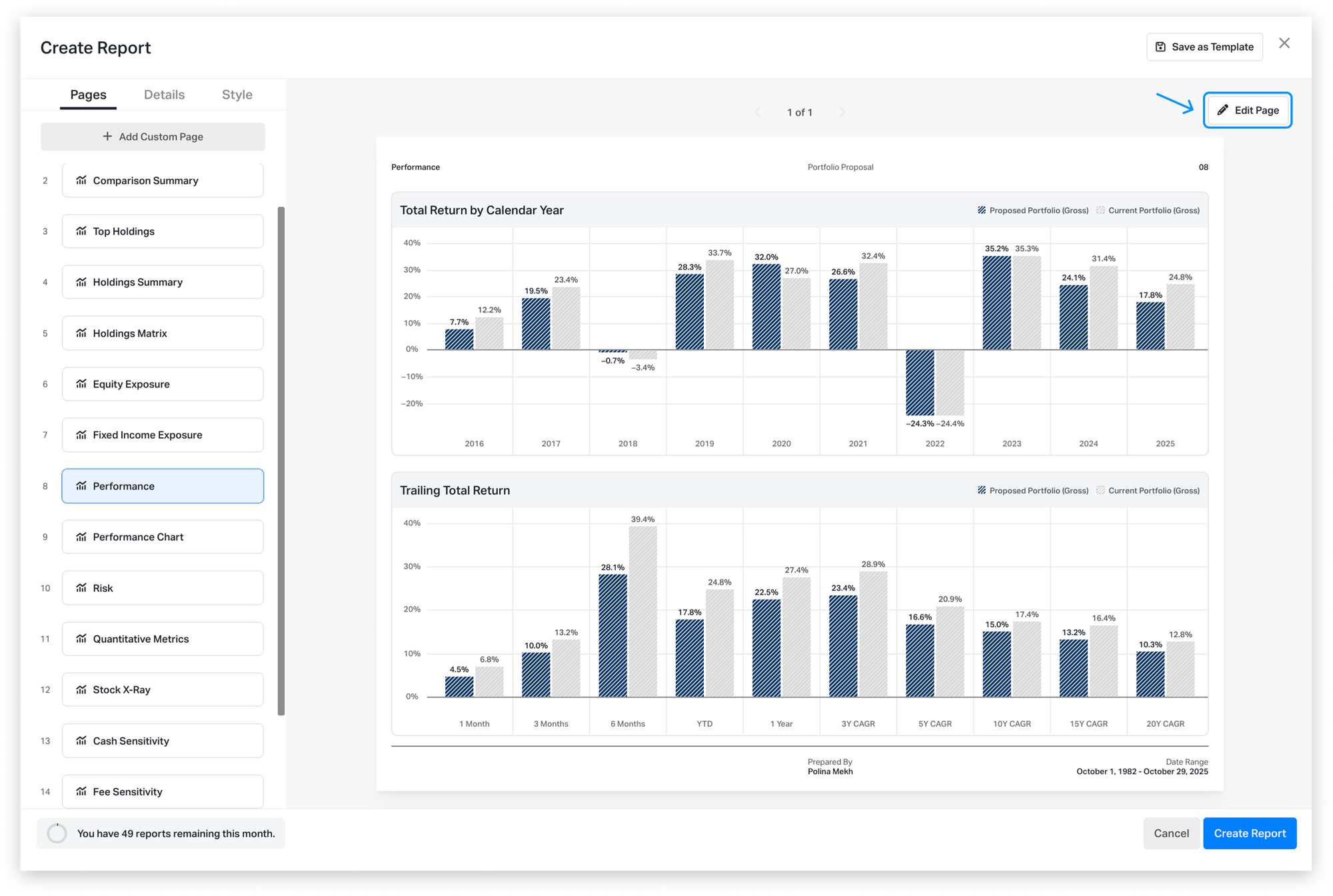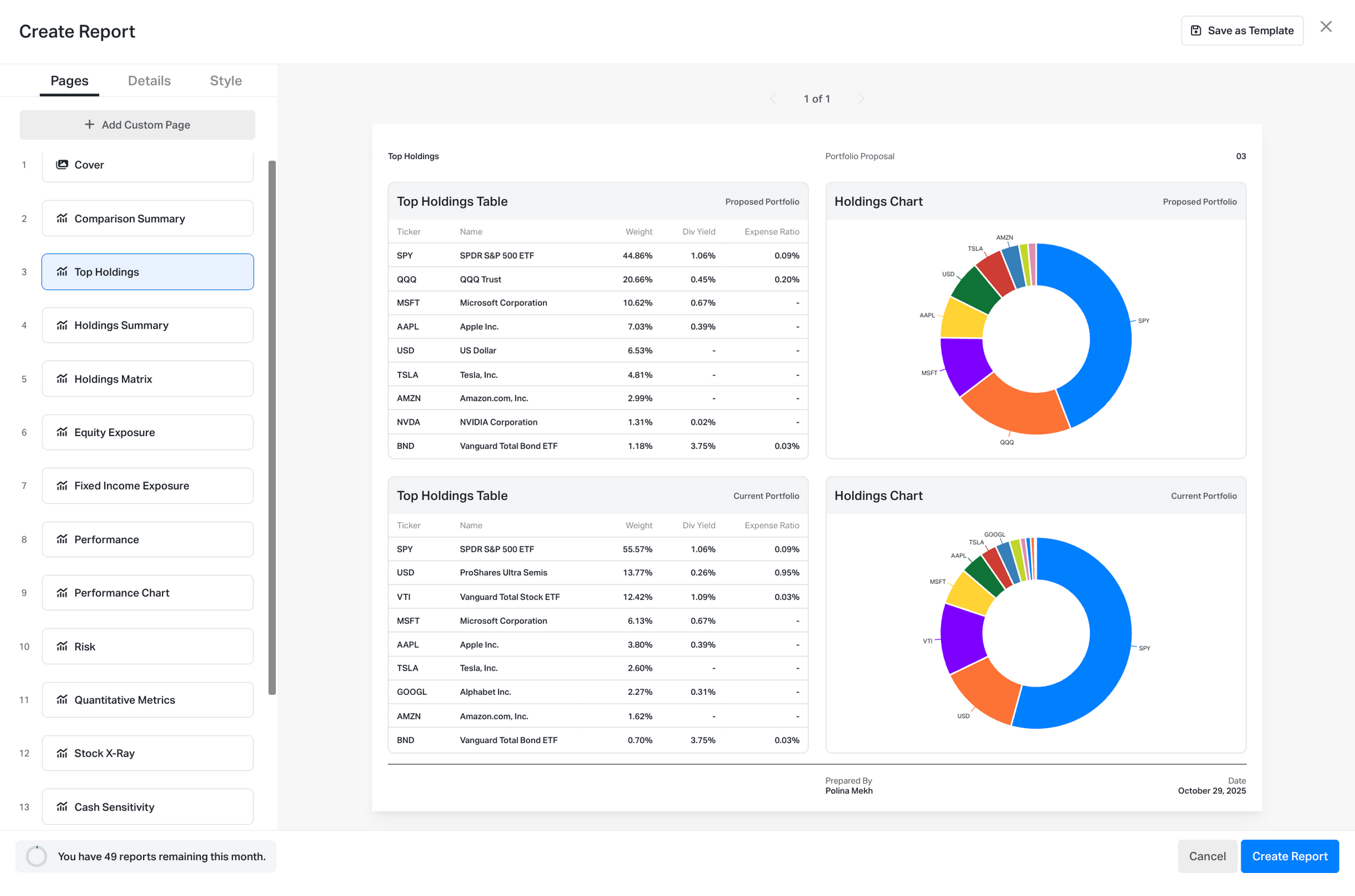 The Top Holdings page includes a table and a chart showing each portfolio’s largest positions by weight. It’s a clear, client-friendly way to show portfolio concentration and diversification at a glance.