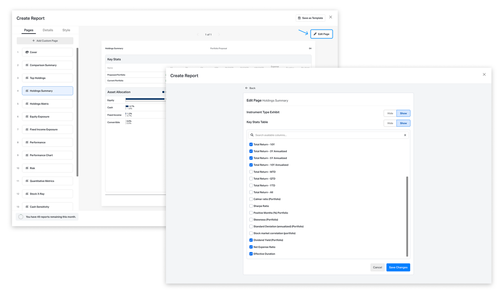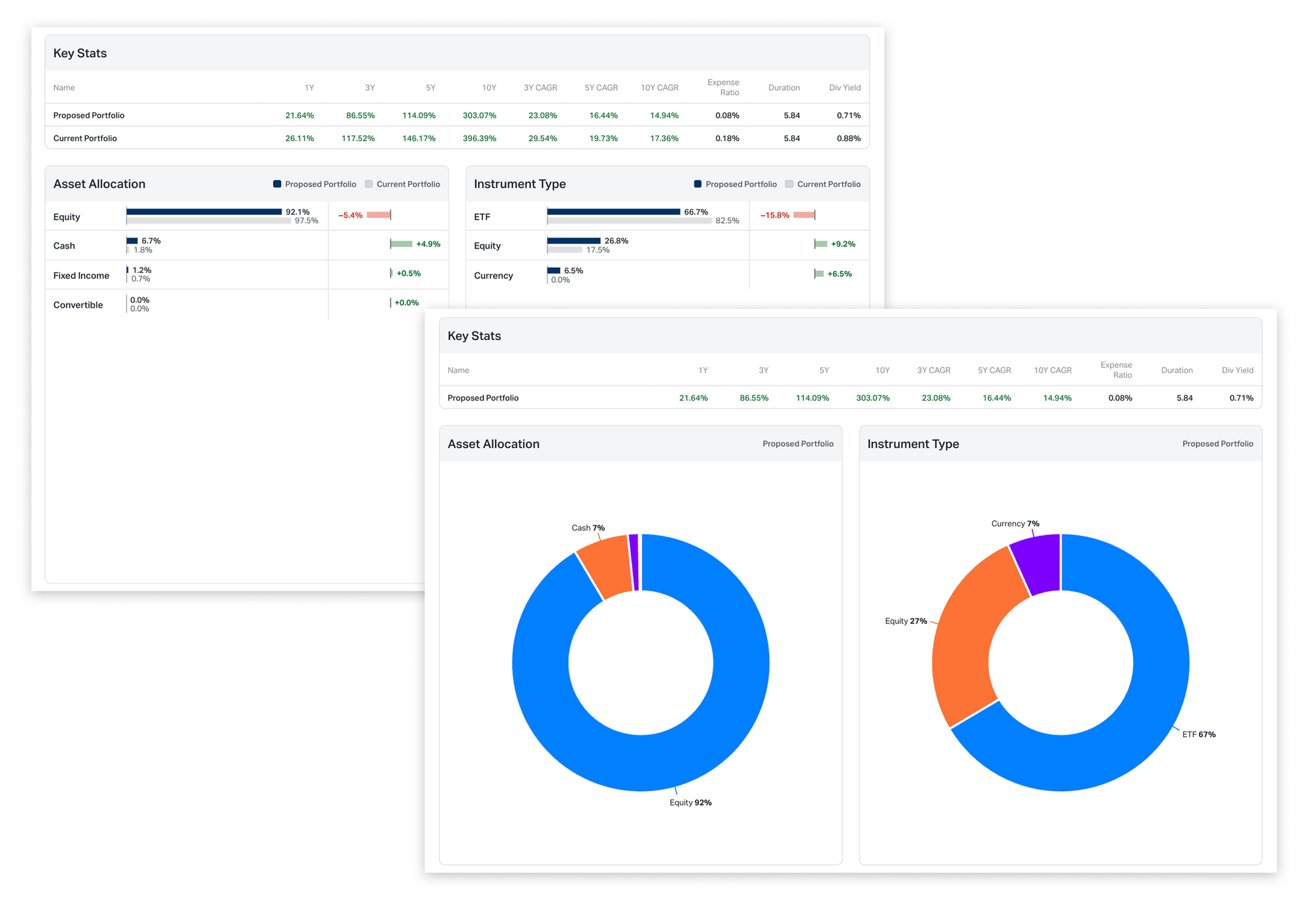 The Holdings Summary page has been reorganized for clarity and now includes a new Instrument Type chart showing exposure by equities, ETFs, mutual funds, and other asset types. The Key Stats table is now customizable too.
