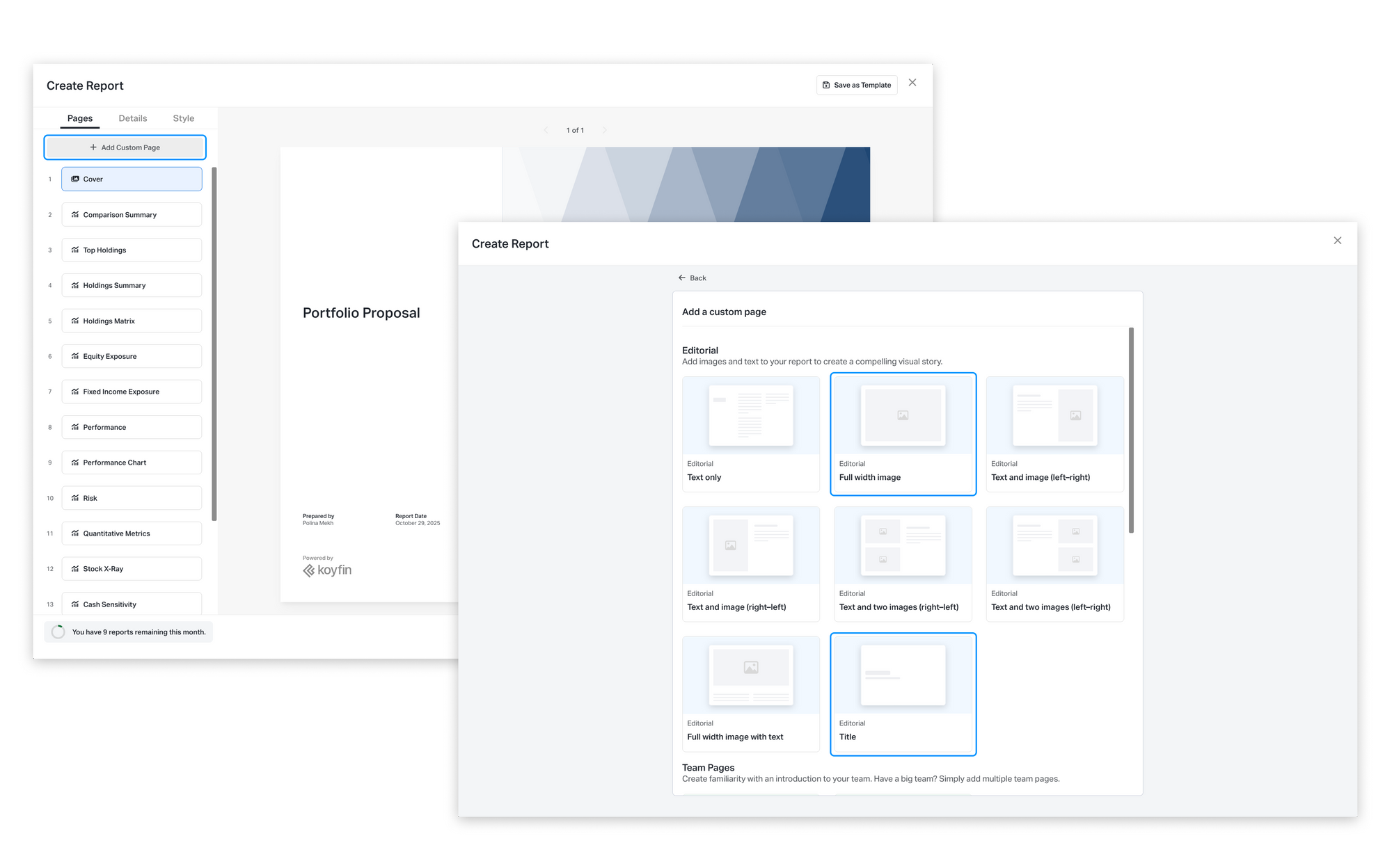 In the report editor, click + Add Custom Page in the left sidebar, then choose your preferred layout. The Title Slide and Full Width Image are found in the Editorial section.