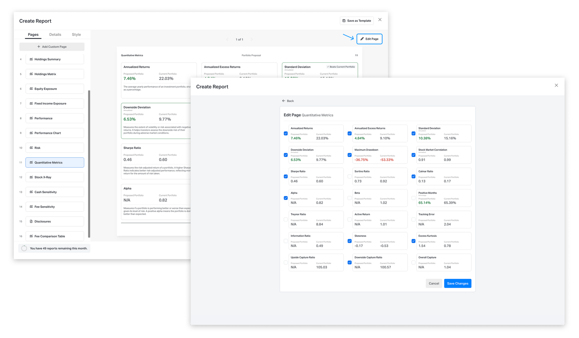 Go to the Quantitative Metrics page in the report editor, click “Edit Page” (top-right corner) to select or deselect the metrics.