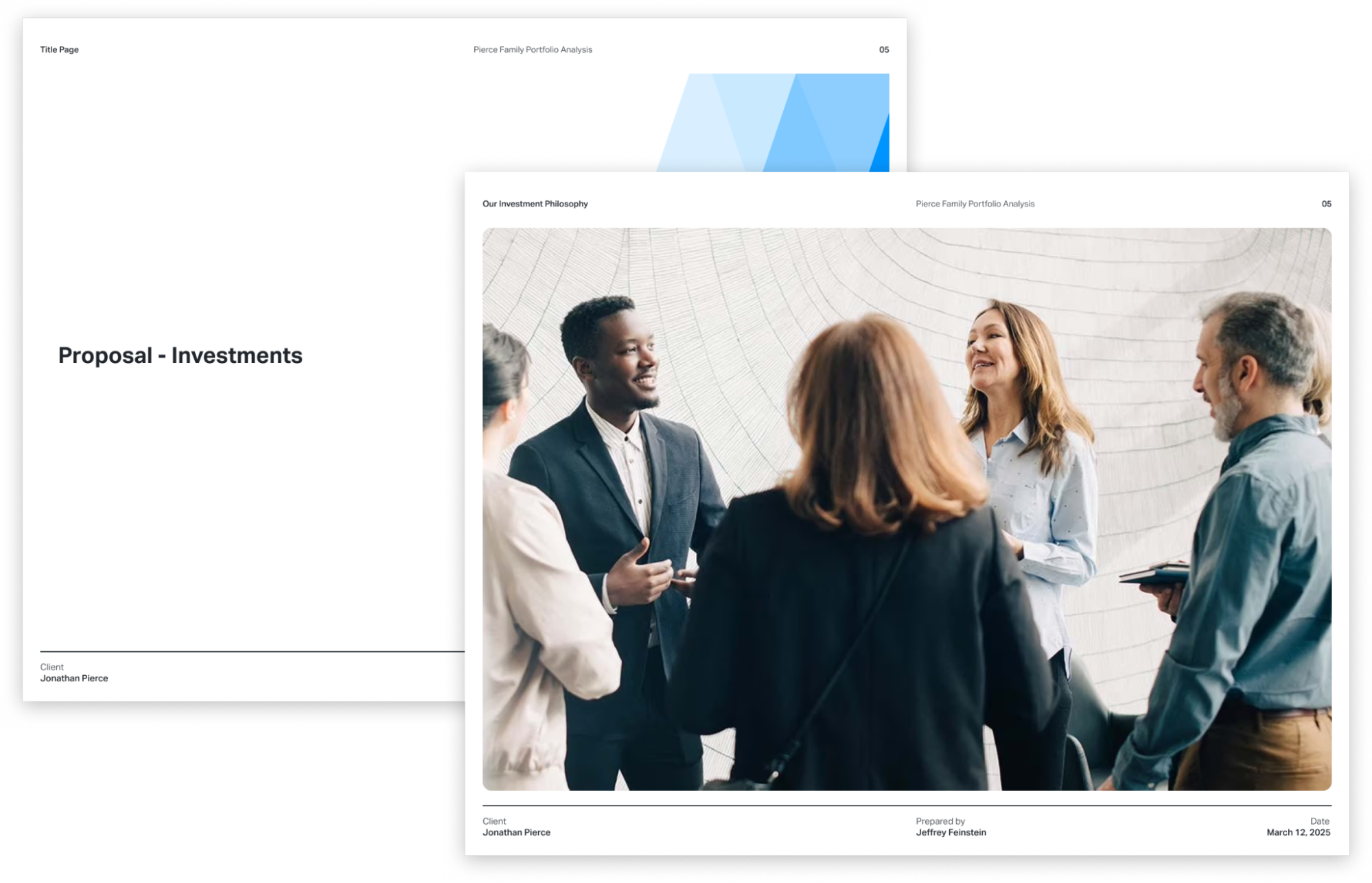 - Title Slide: Add an editable title and subtitle to separate report sections (e.g., Portfolio Overview or Market Outlook).