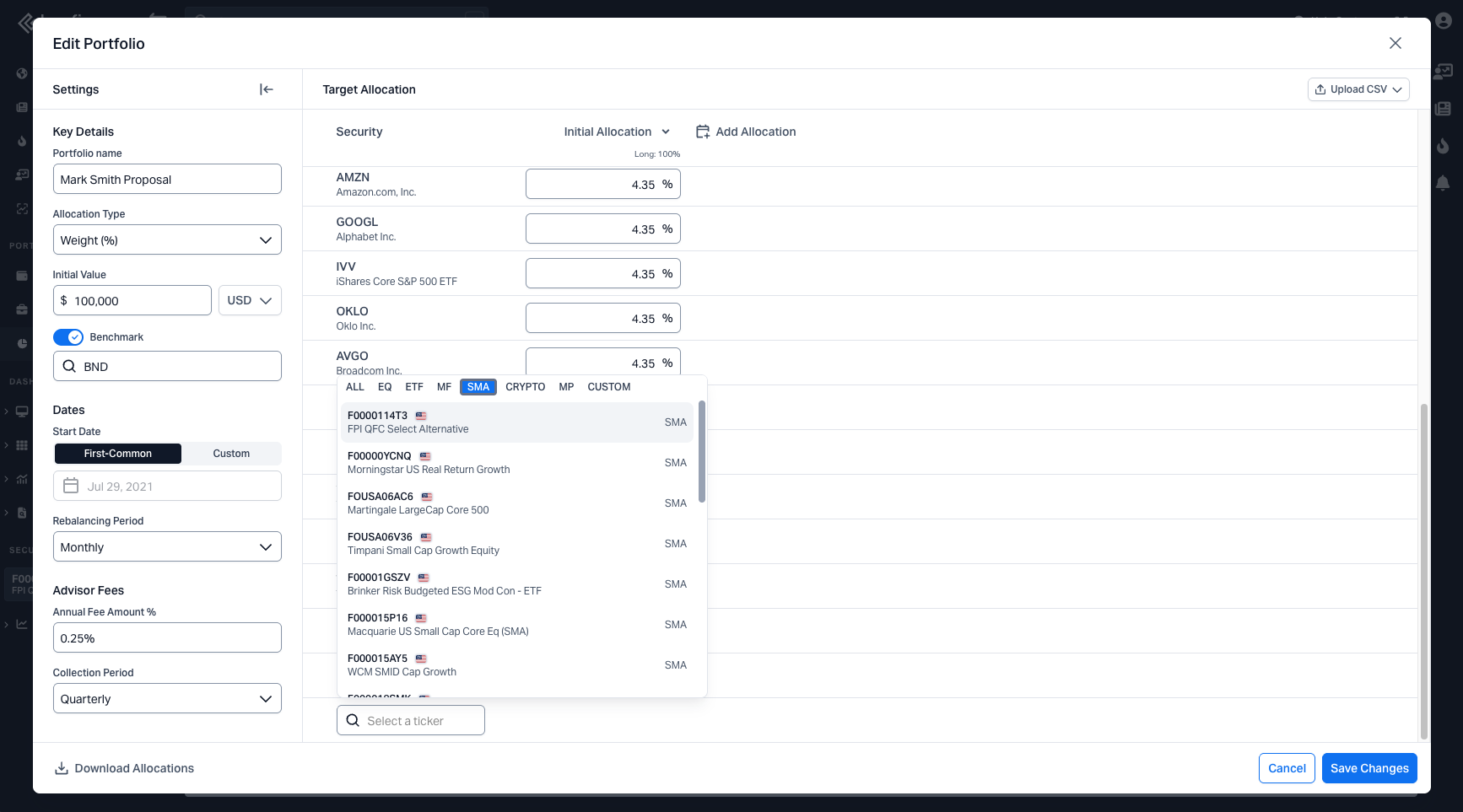 - Add SMAs as holdings when building or adjusting portfolio allocations.