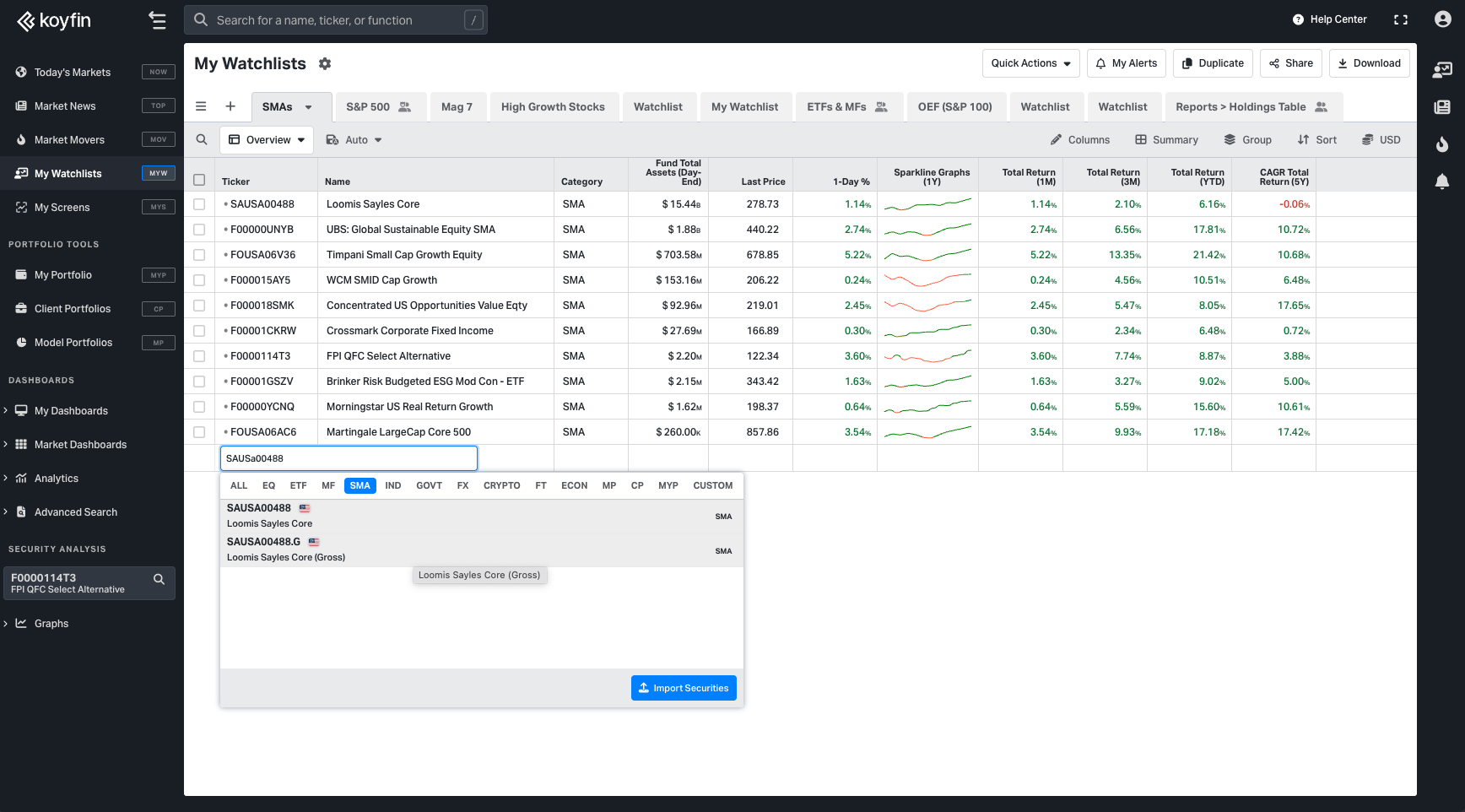 You can research SMA strategies, analyze performance, compare them to other funds, and include SMAs in Client Portfolios, Model Portfolios, and My Portfolios.