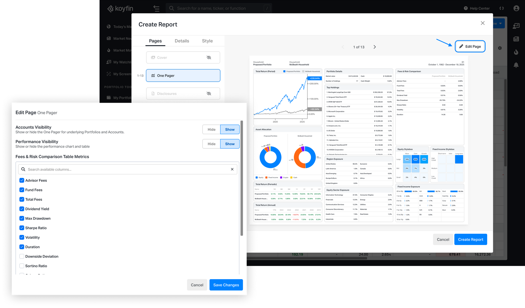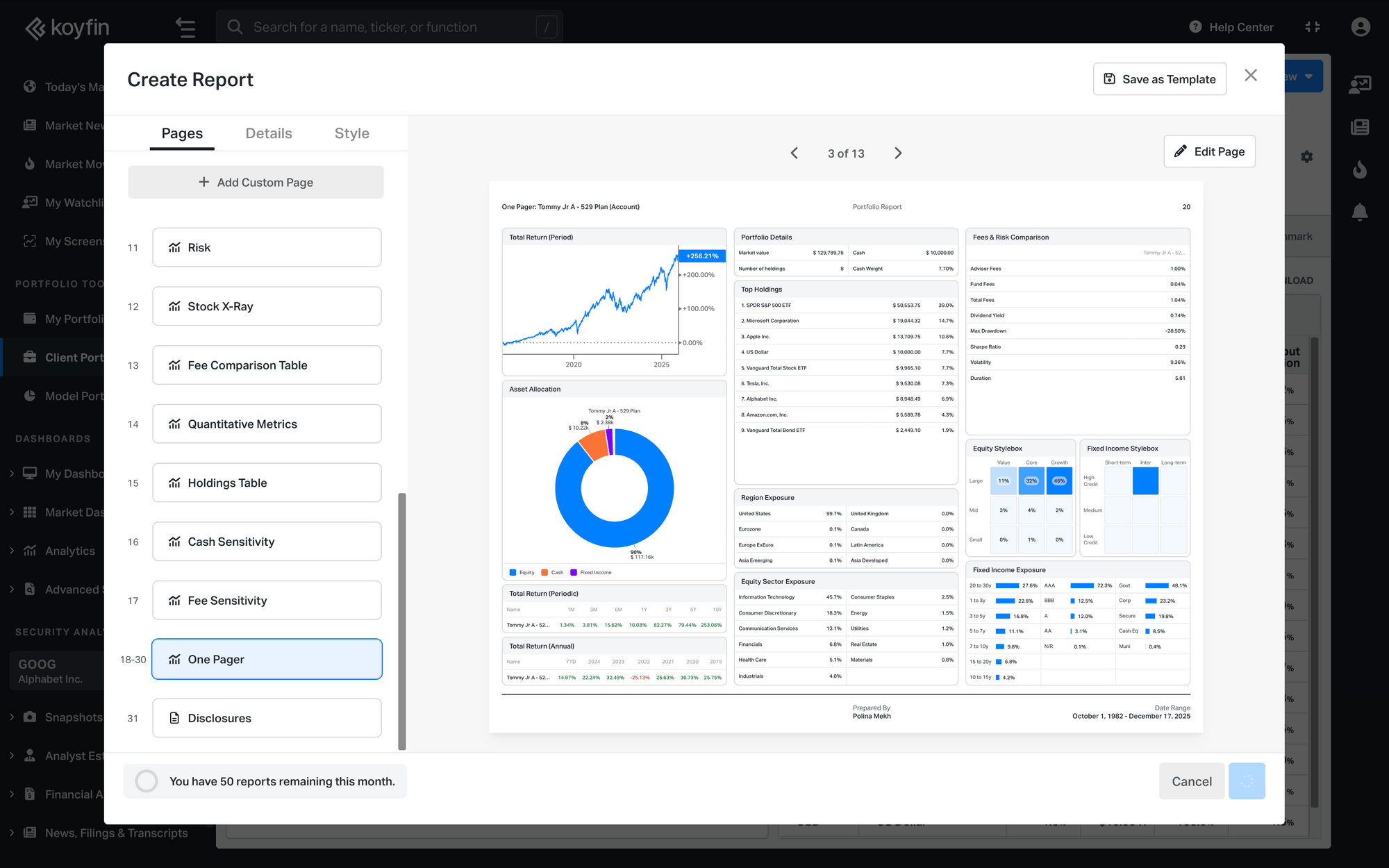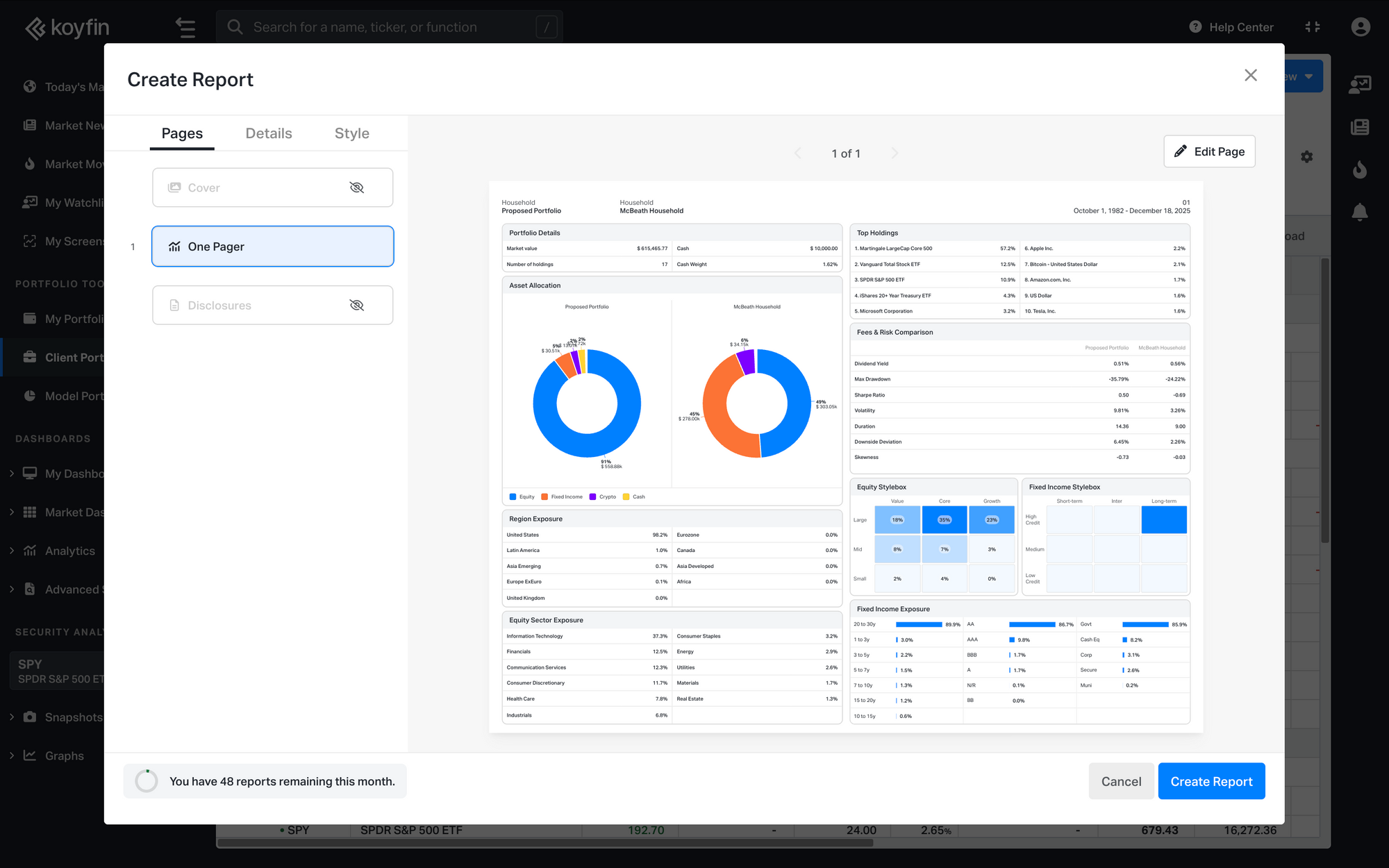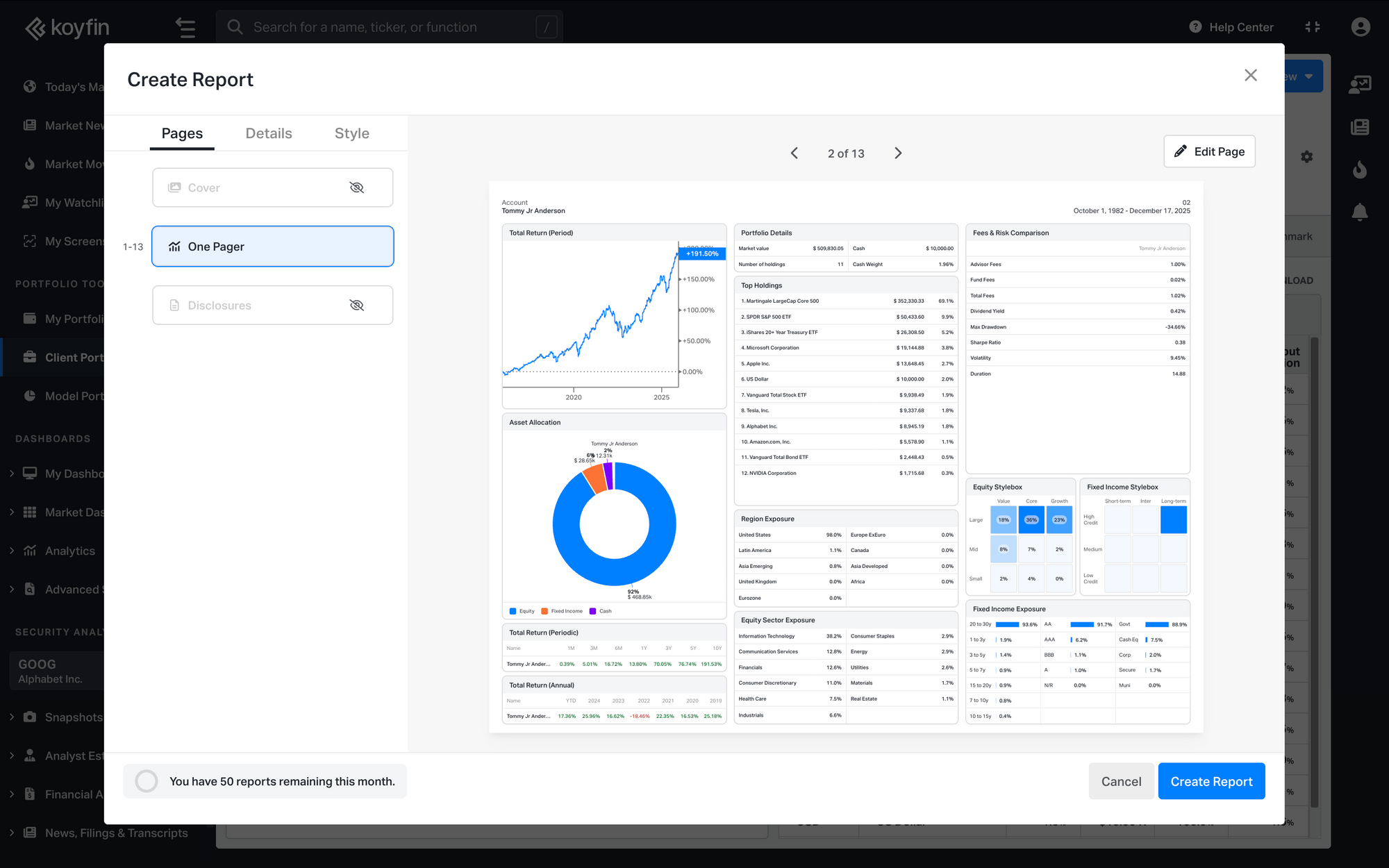 The One Pager brings together key portfolio data in one view, including portfolio details, top holdings, equity and fixed income exposures, asset allocation, performance, and fees and risk metrics.