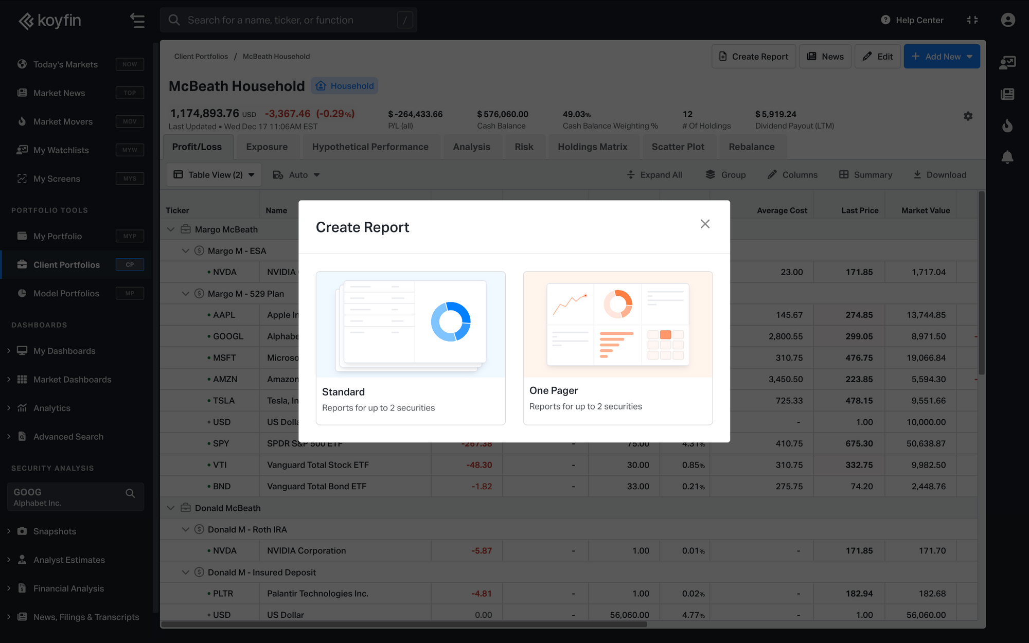 For Client Portfolios, holdings and allocations are shown with both dollar values and weights. When reporting on a Household or Portfolio, the One Pager can expand across multiple pages to show each underlying Portfolio and Account separately.