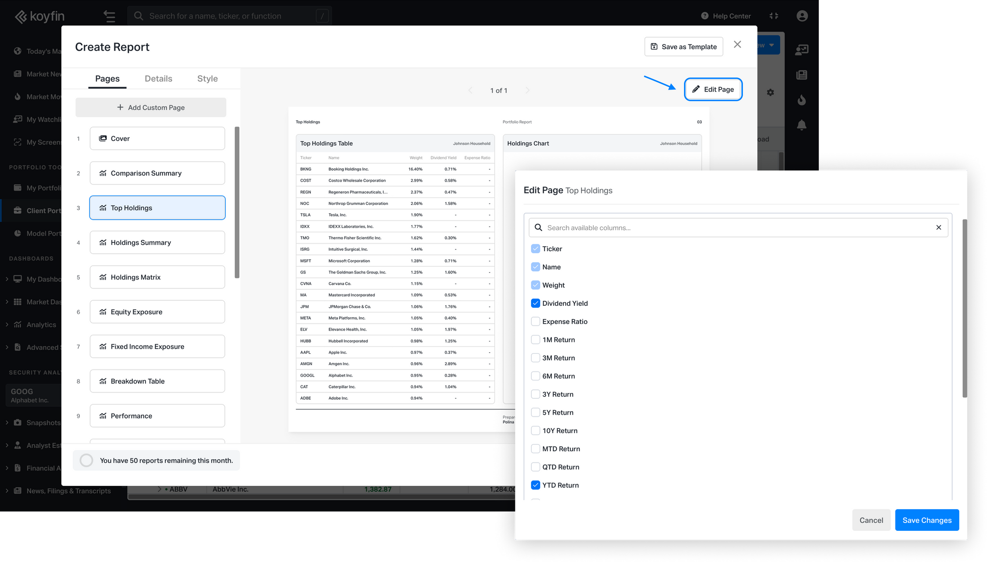 By default, the table shows Ticker, Name, Weight, Dividend Yield, and Expense Ratio. With the new edit option, you can replace Dividend Yield and Expense Ratio with other metrics that better match how you present holdings to clients.