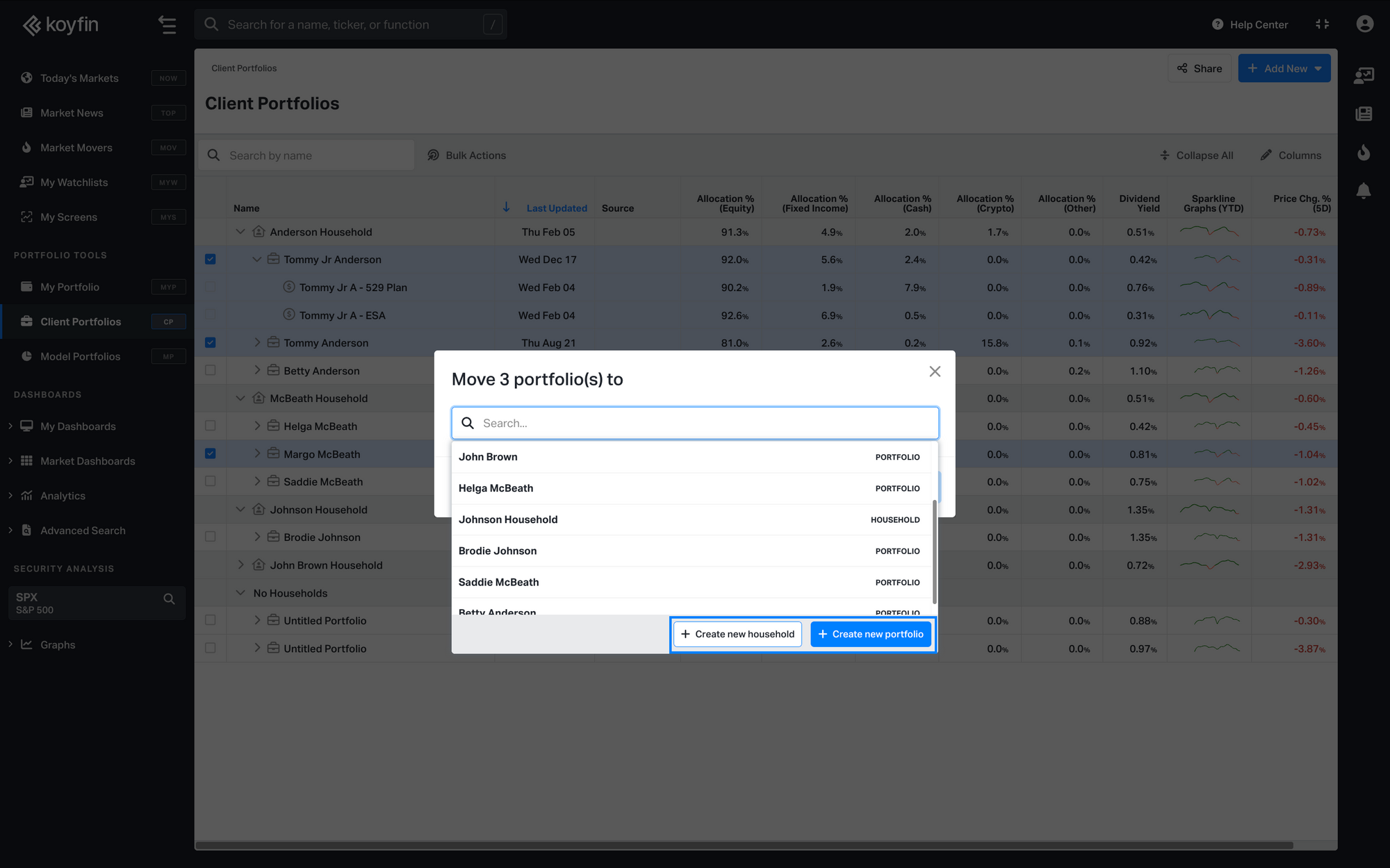 5. If your destination doesn't exist yet, click Create new household or Create new portfolio at the bottom of the modal.