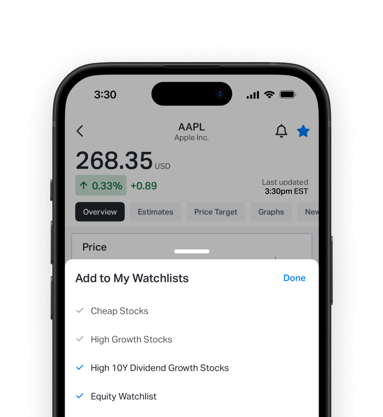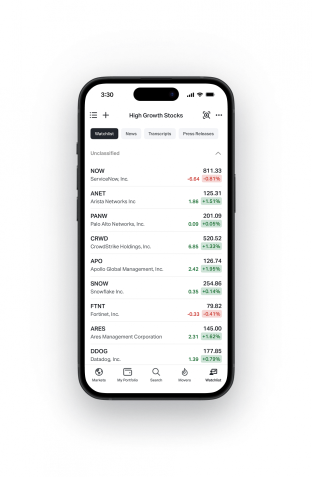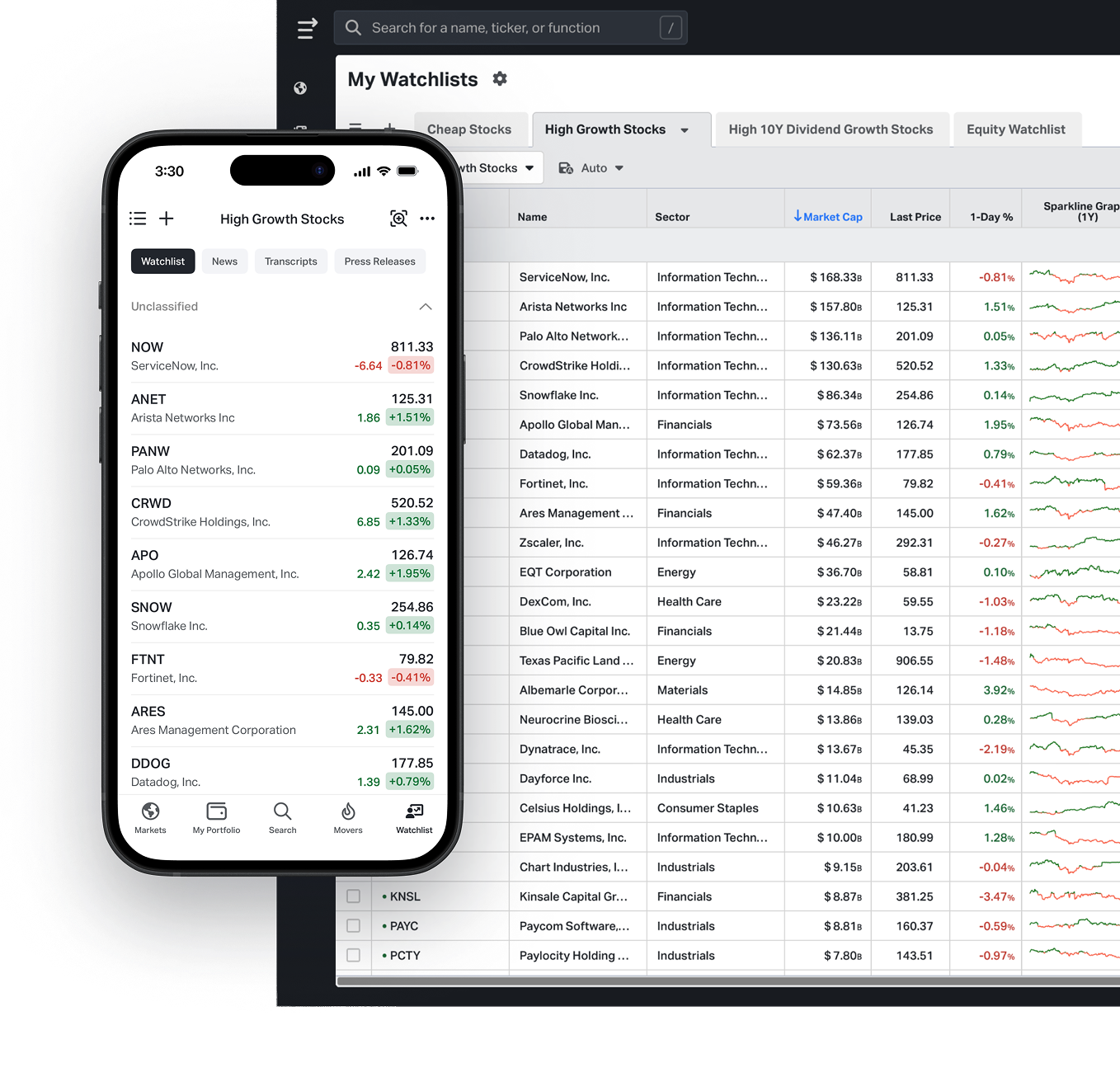 Inspiration strikes in the strangest places, that’s why you can edit your watchlists on the go and they’ll seamlessly sync with the Koyfin web app.