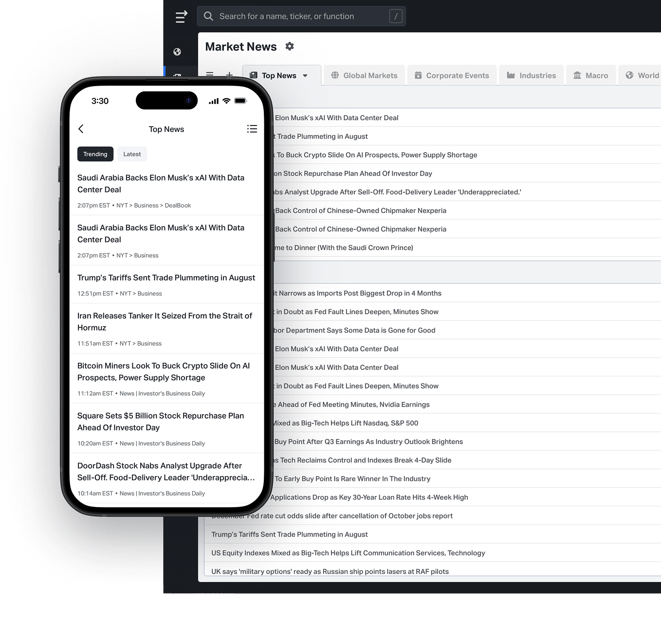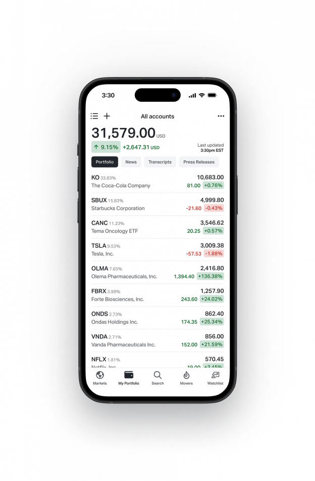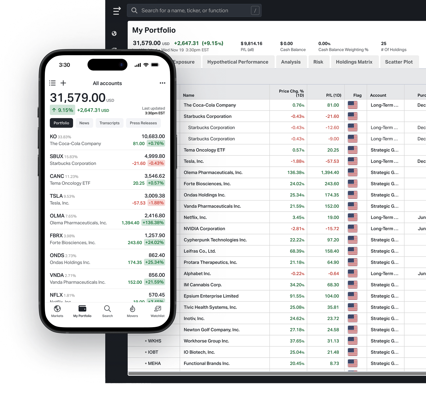Wherever you go, the Koyfin mobile app lets you track your portfolio with My Portfolio, synced seamlessly with desktop.