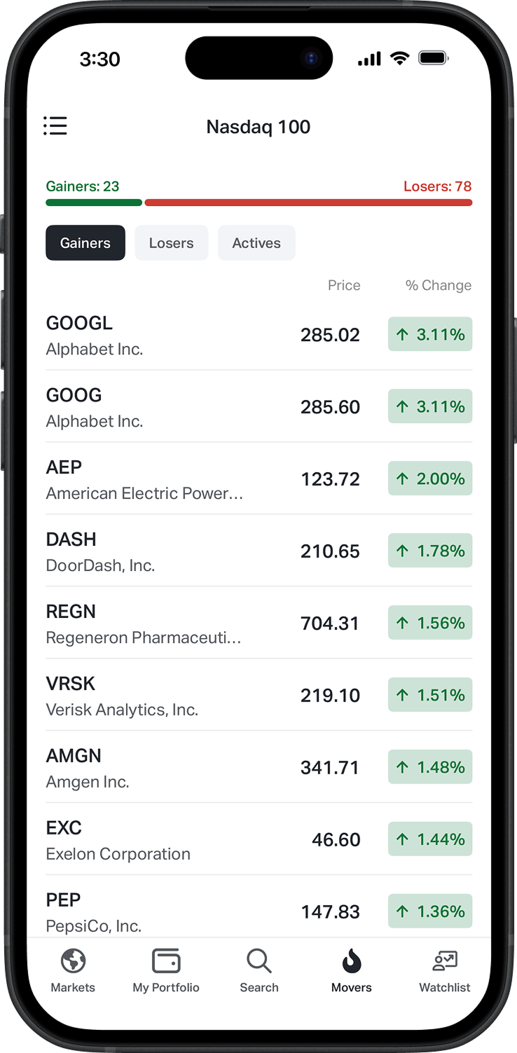 We know that you’re on the move as much as the markets. That’s why the Koyfin mobile app shows you the biggest gainers and losers across major indices and all your personalized watchlists on one easy-to-view screen.